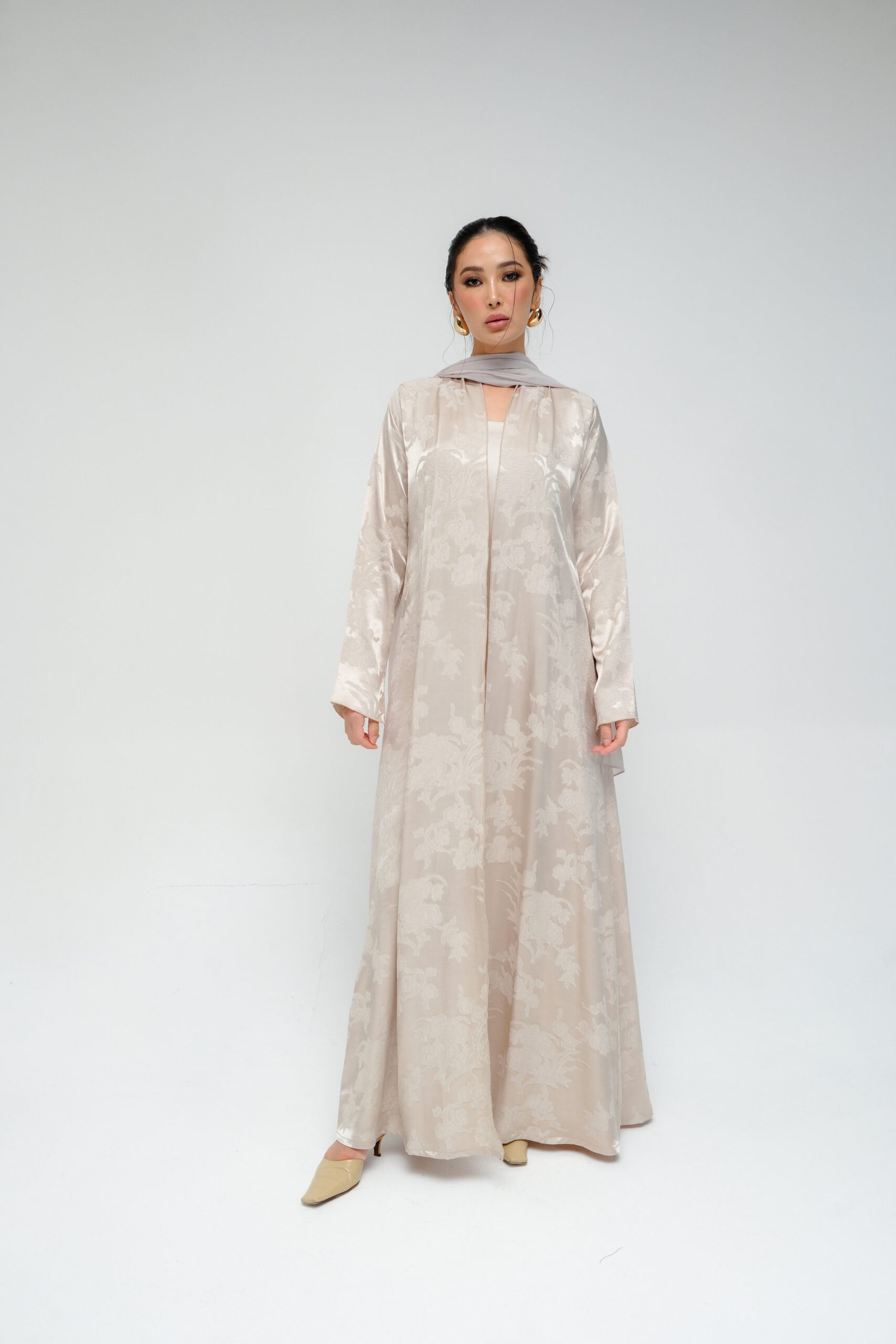 A sleek T-cut abaya in sil