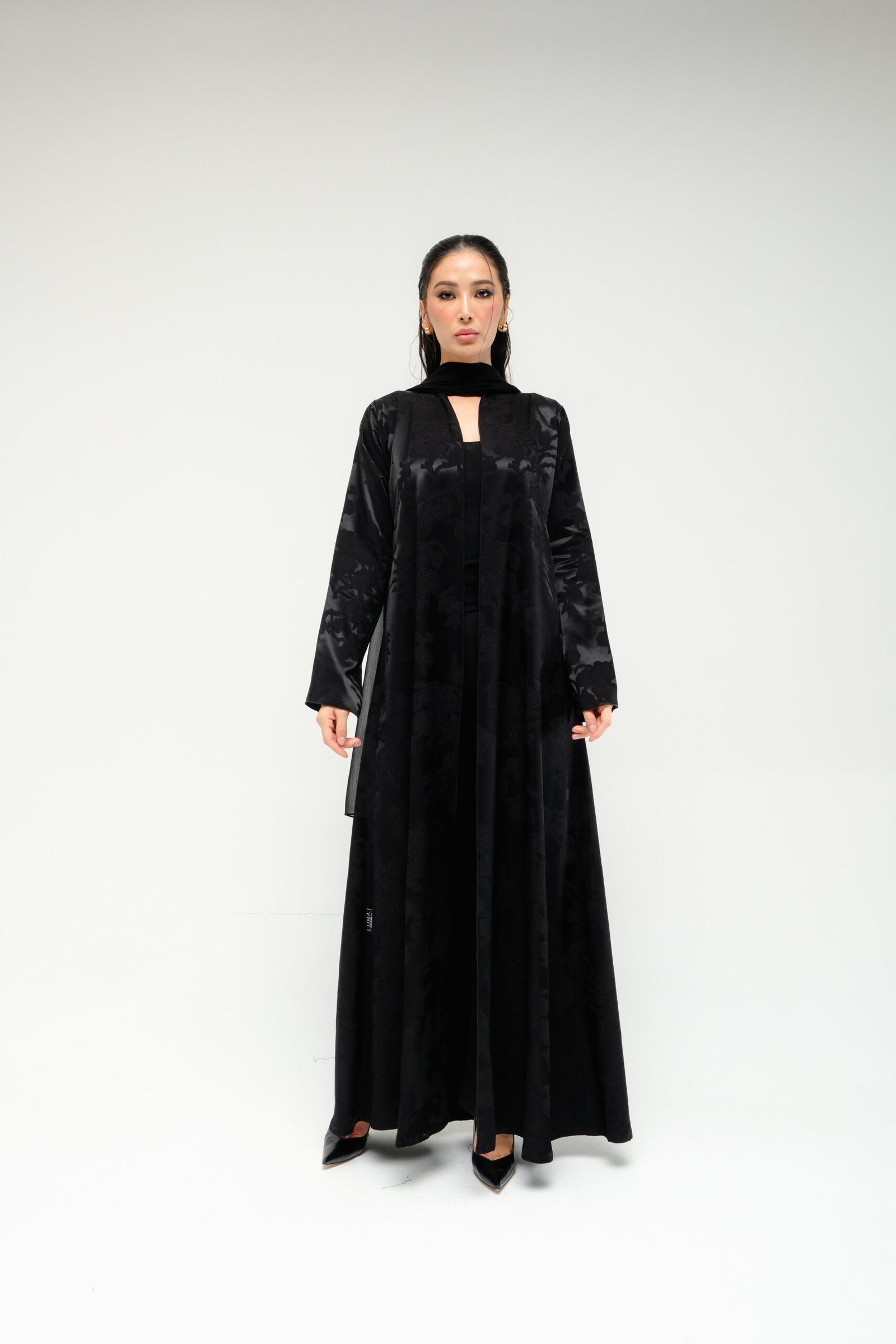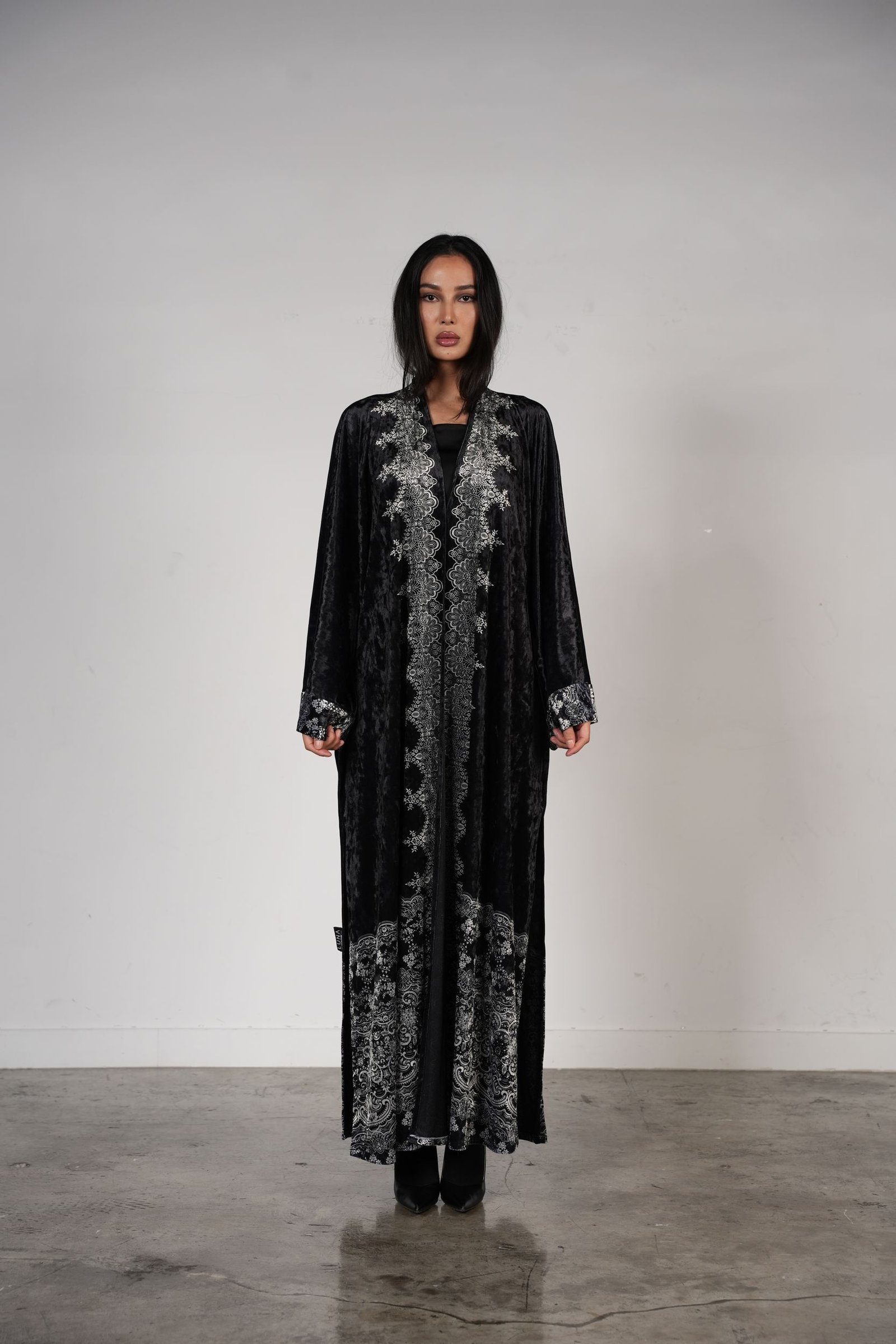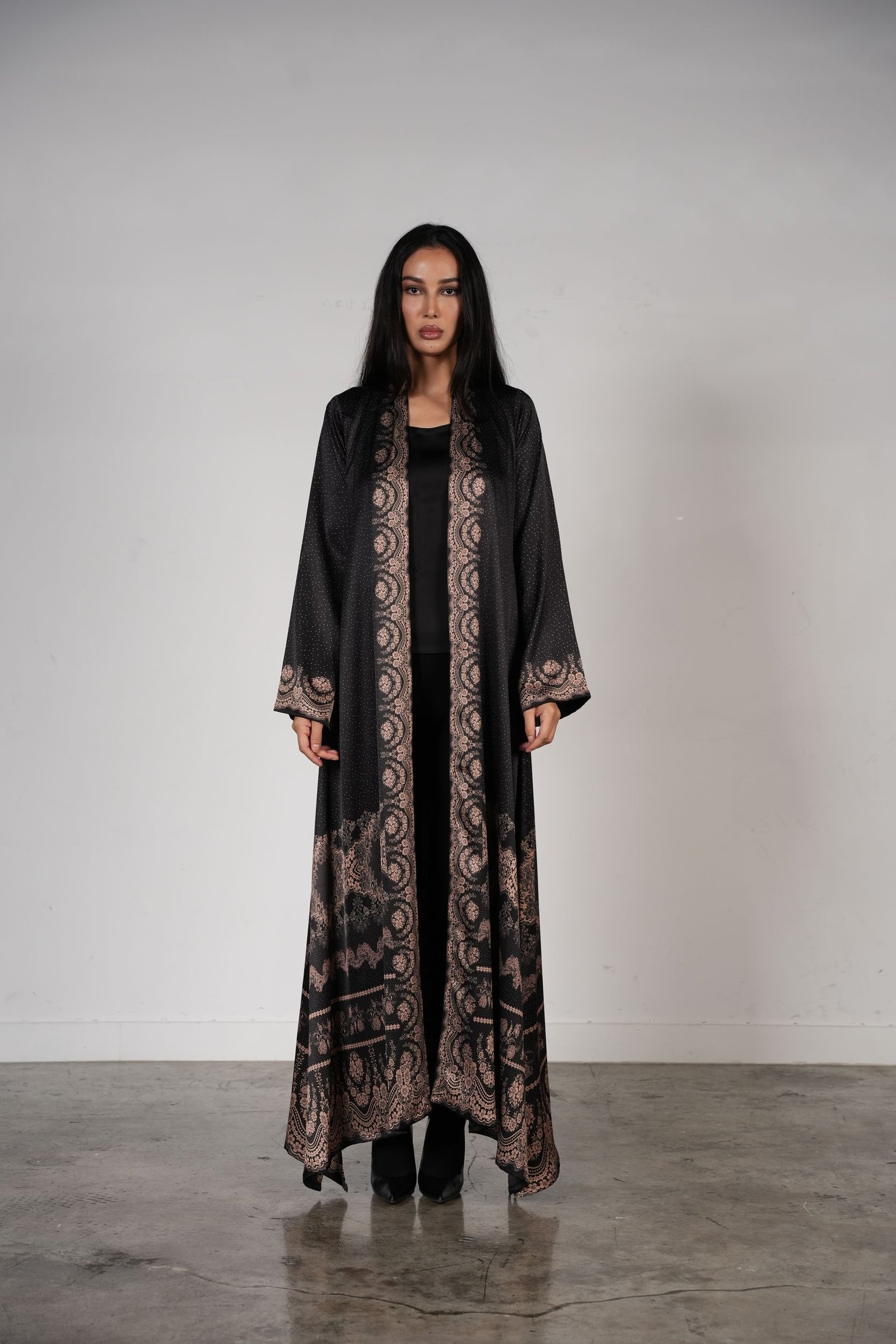A luxe black abaya featuri