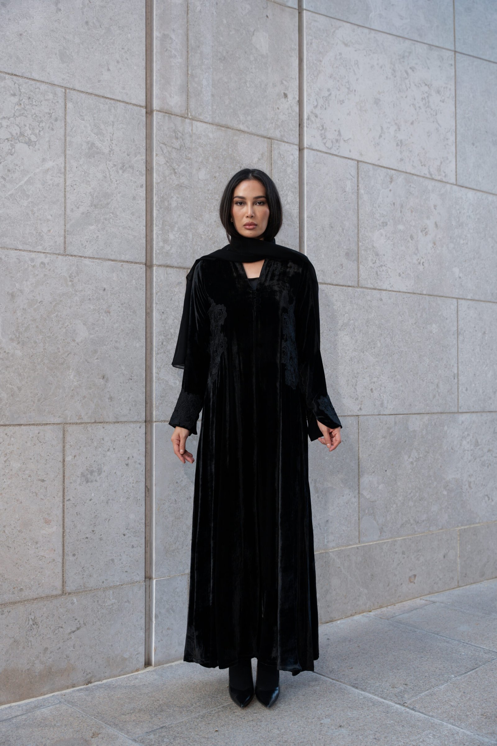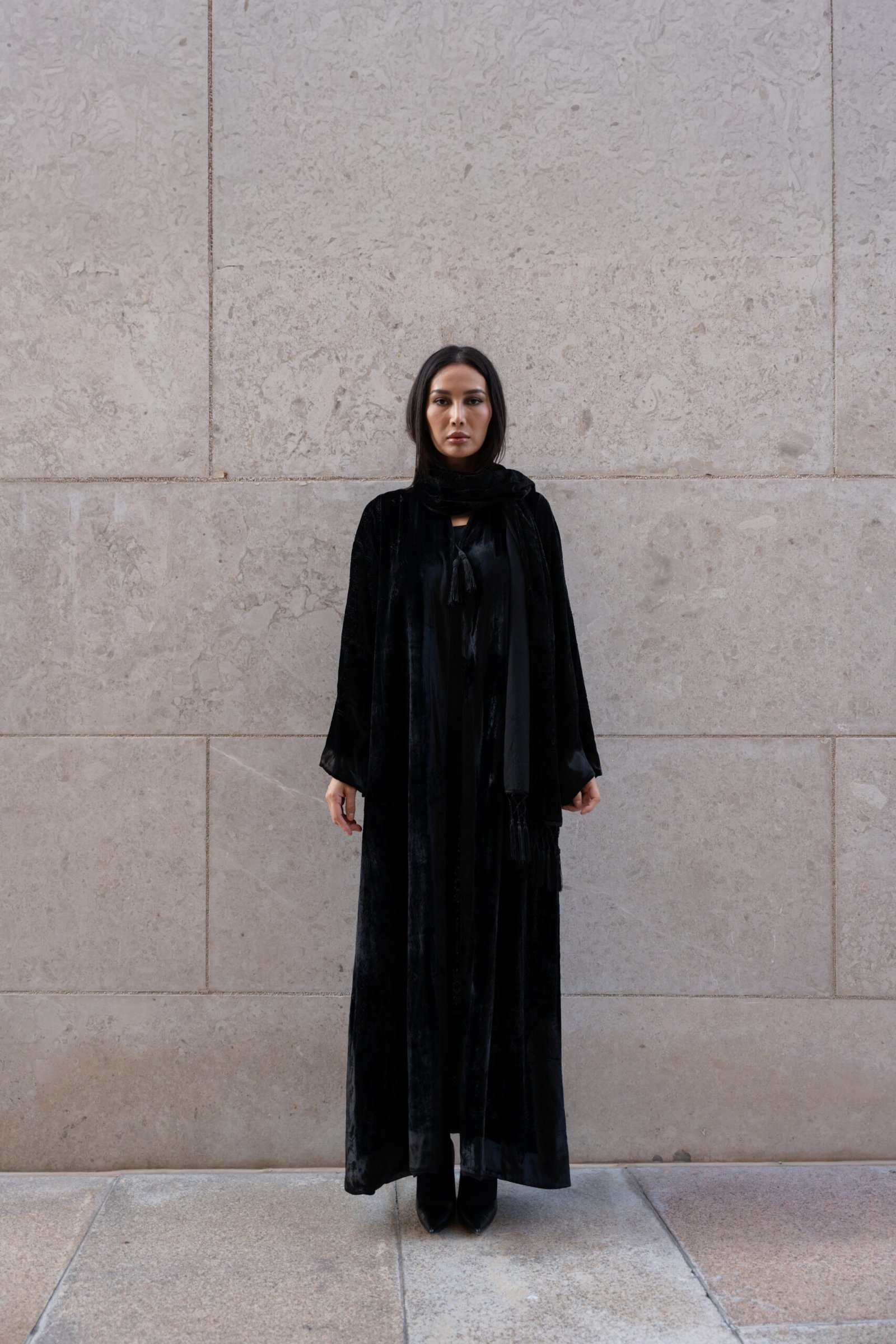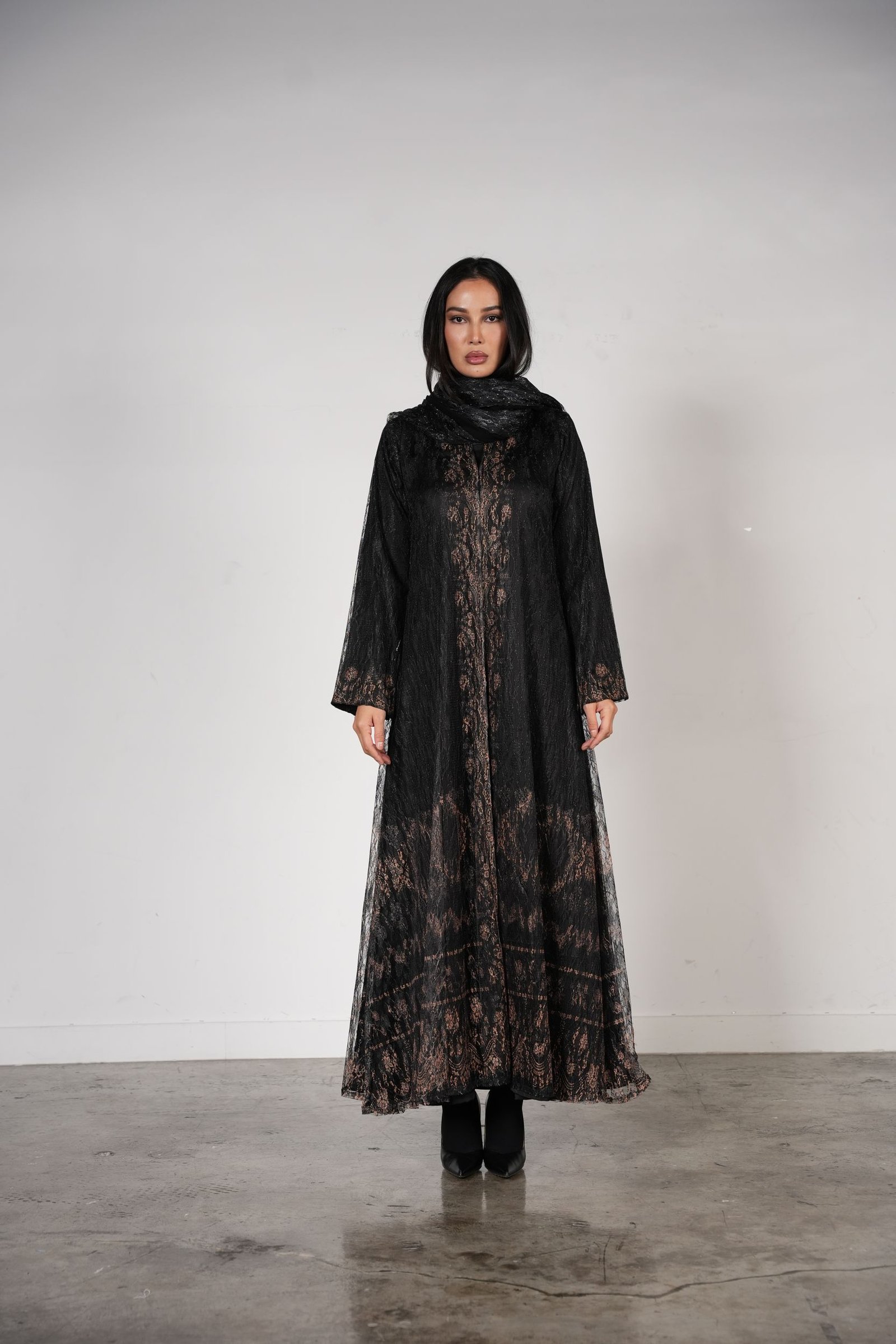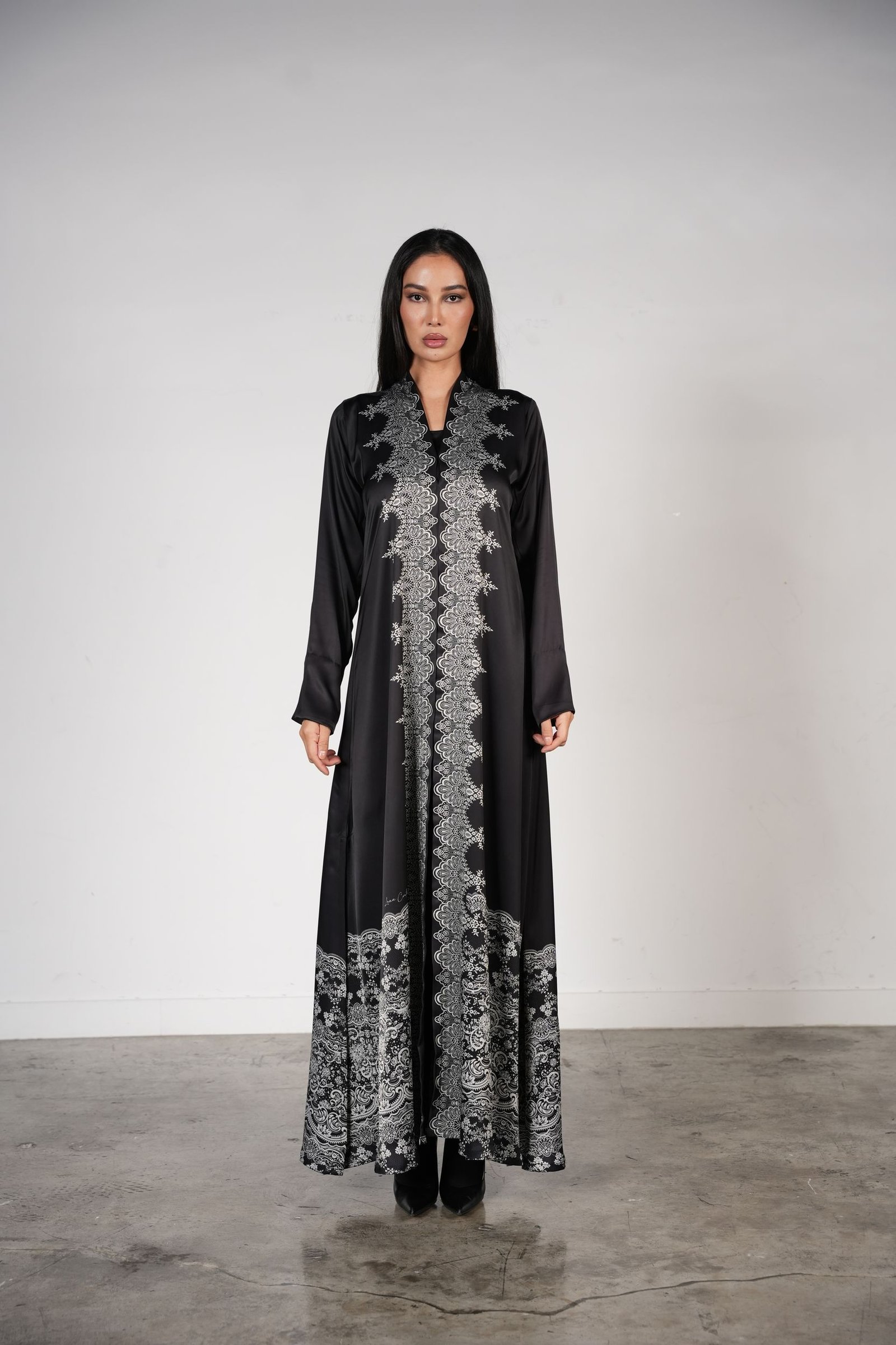 A luxe black abaya featuri