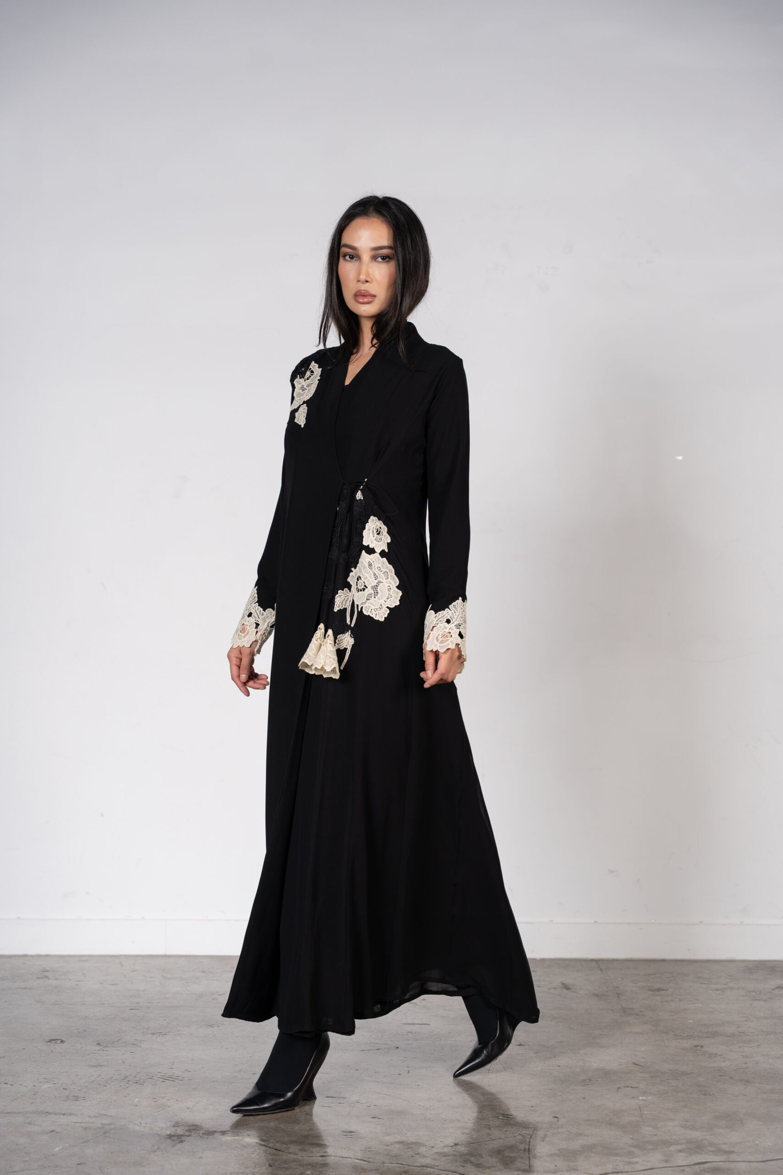 Step into the world of refined elegance with the floral beige lace fantasy design. The A-line cut provides a flattering and graceful silhouette, while the overlap front with cone tie closure adds a unique and stylish touch.