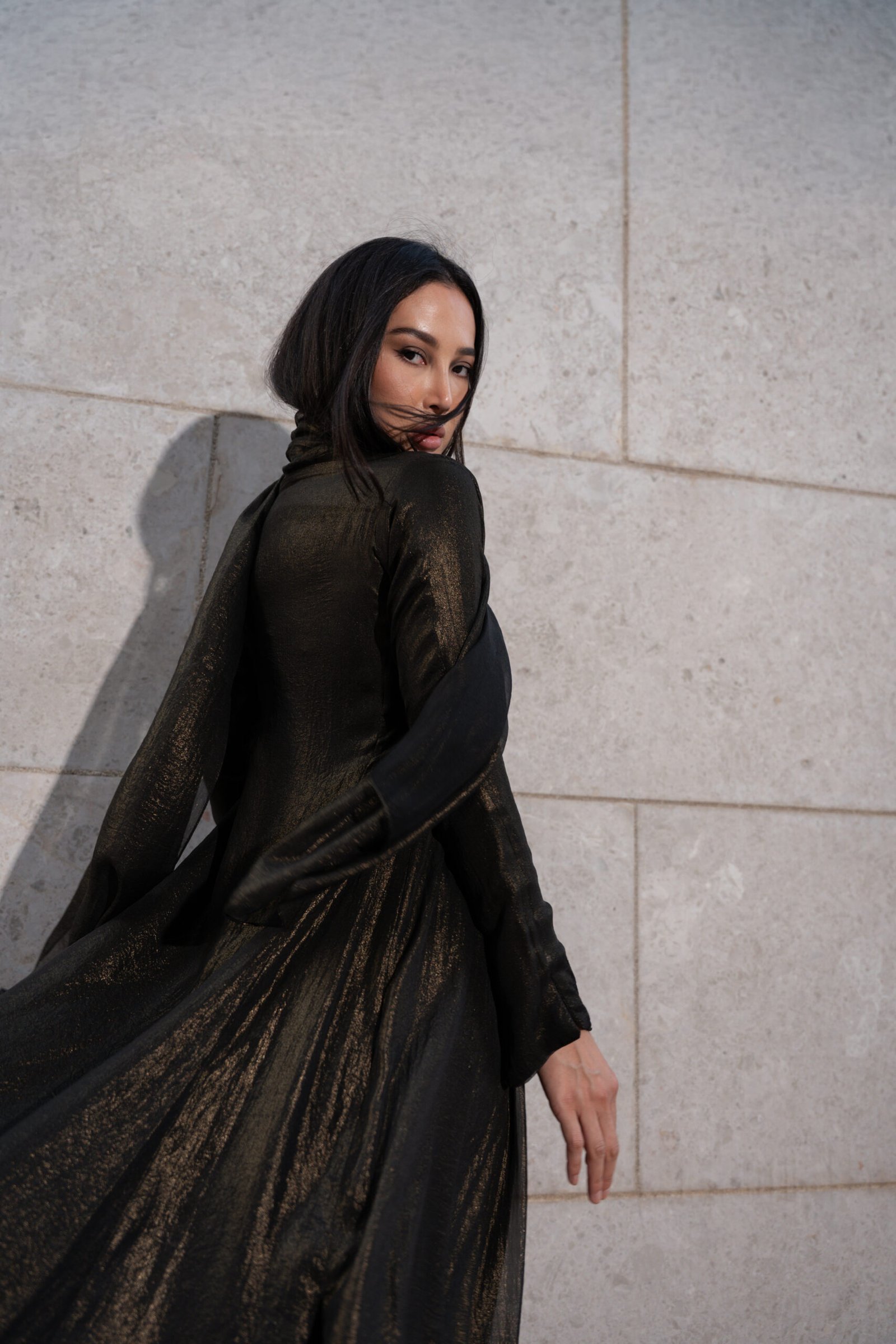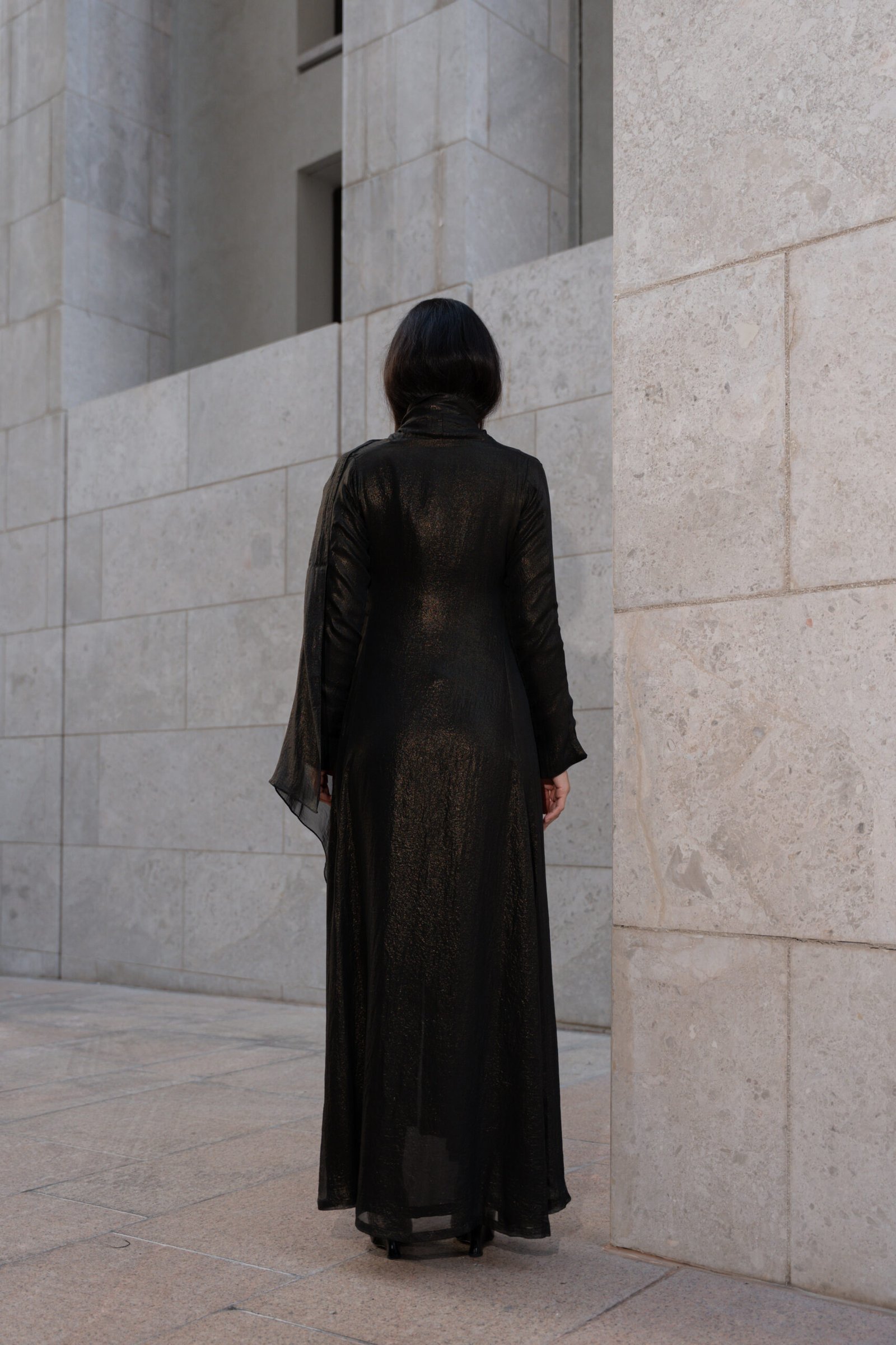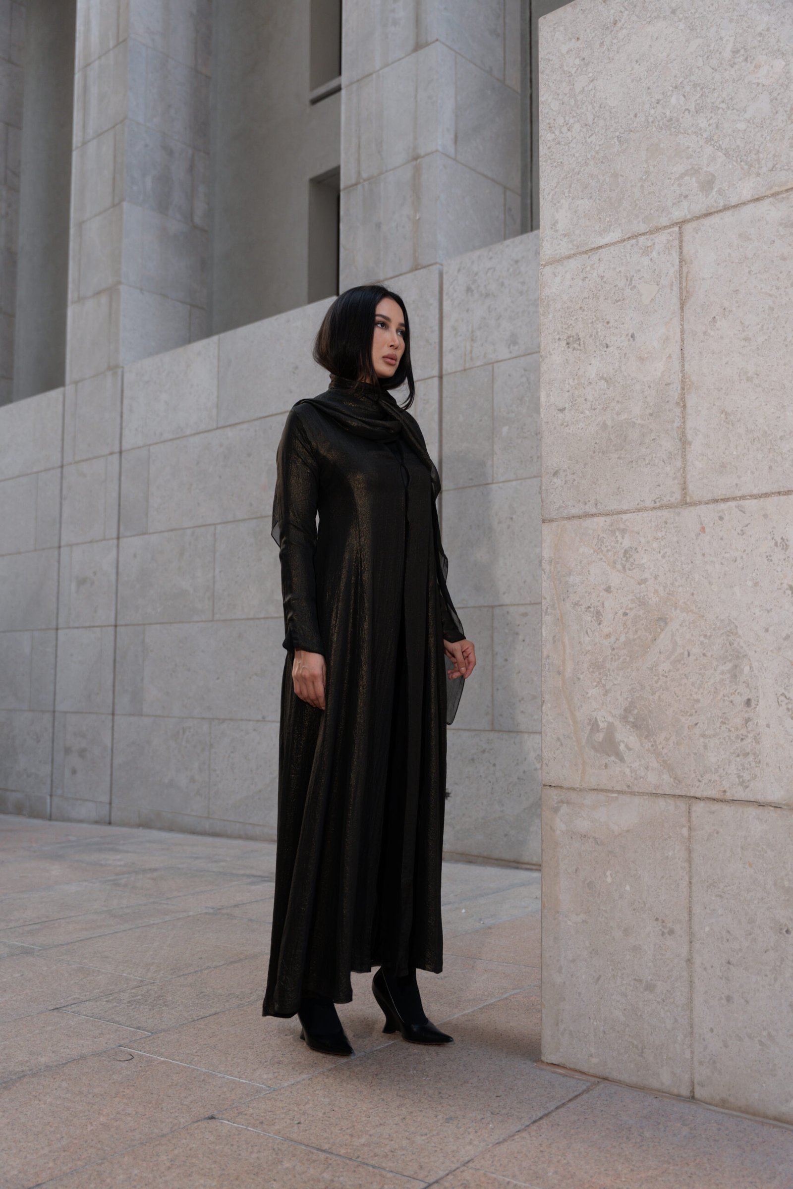 A luxe black abaya featuring a delicate gold tinted shimmer for refined modern finish. The lightweight fabric moves gracefully. Designed in San elegant A-line curve cut that enhances movement and flow. It features side slits paired with a matching head scarf for complete.