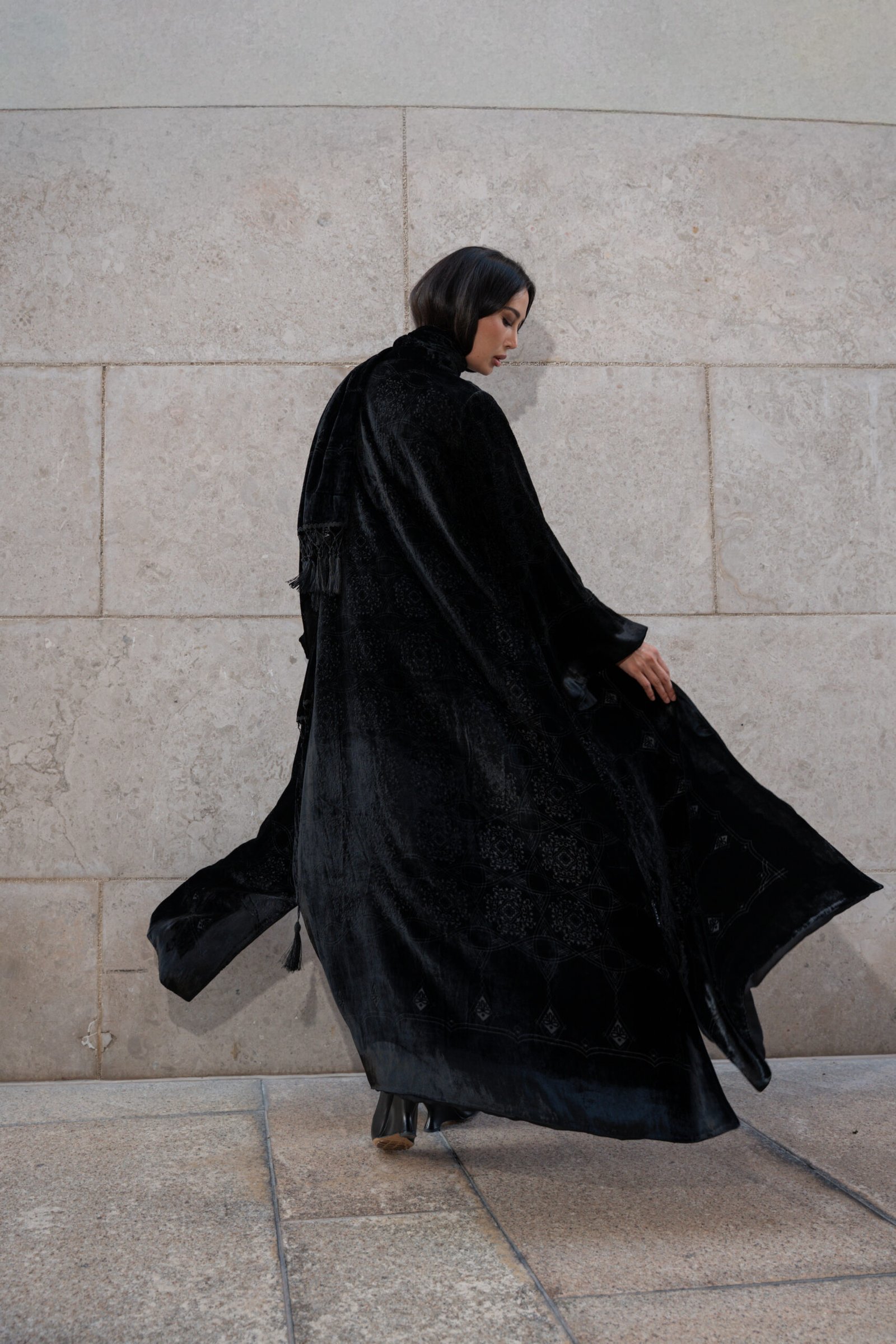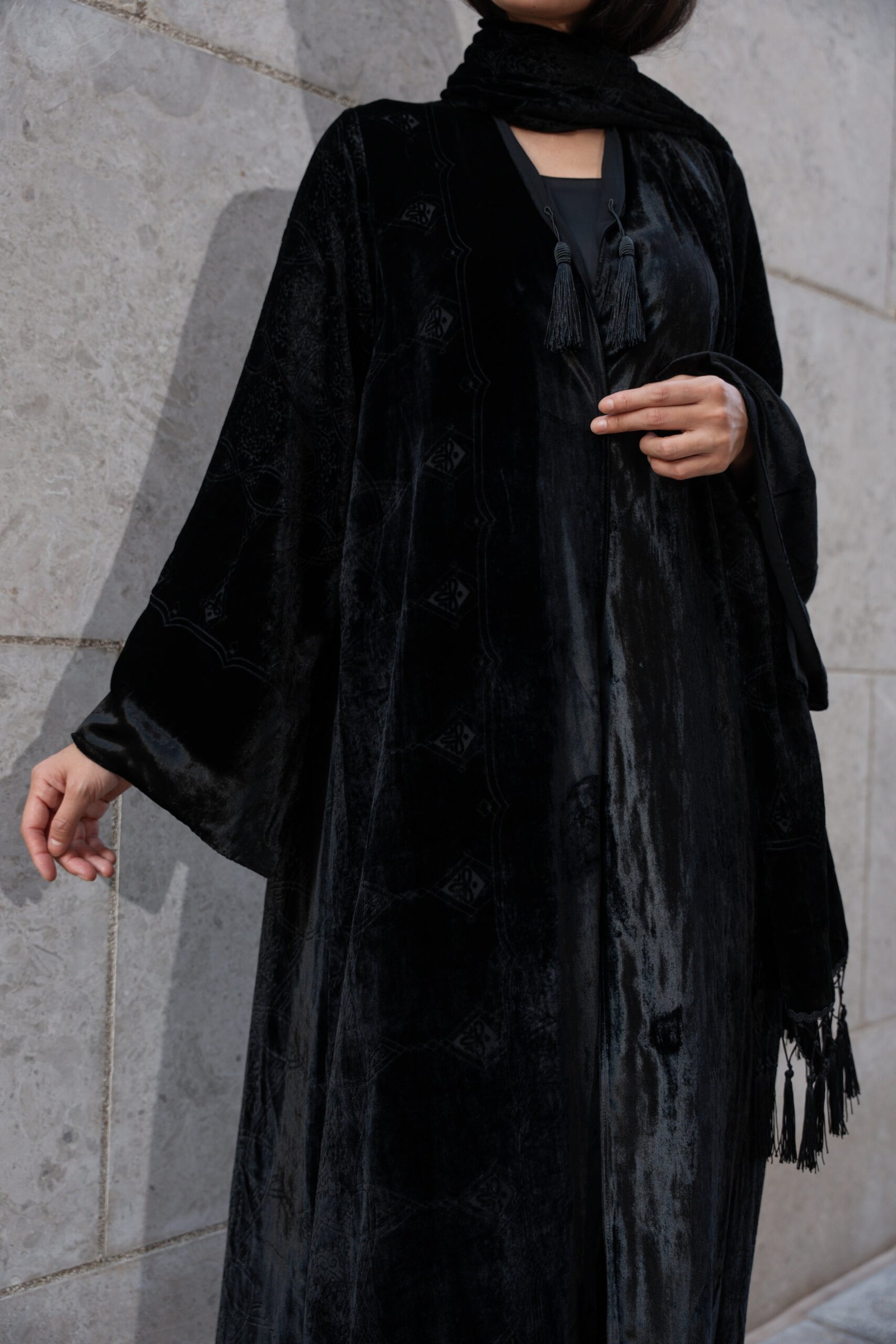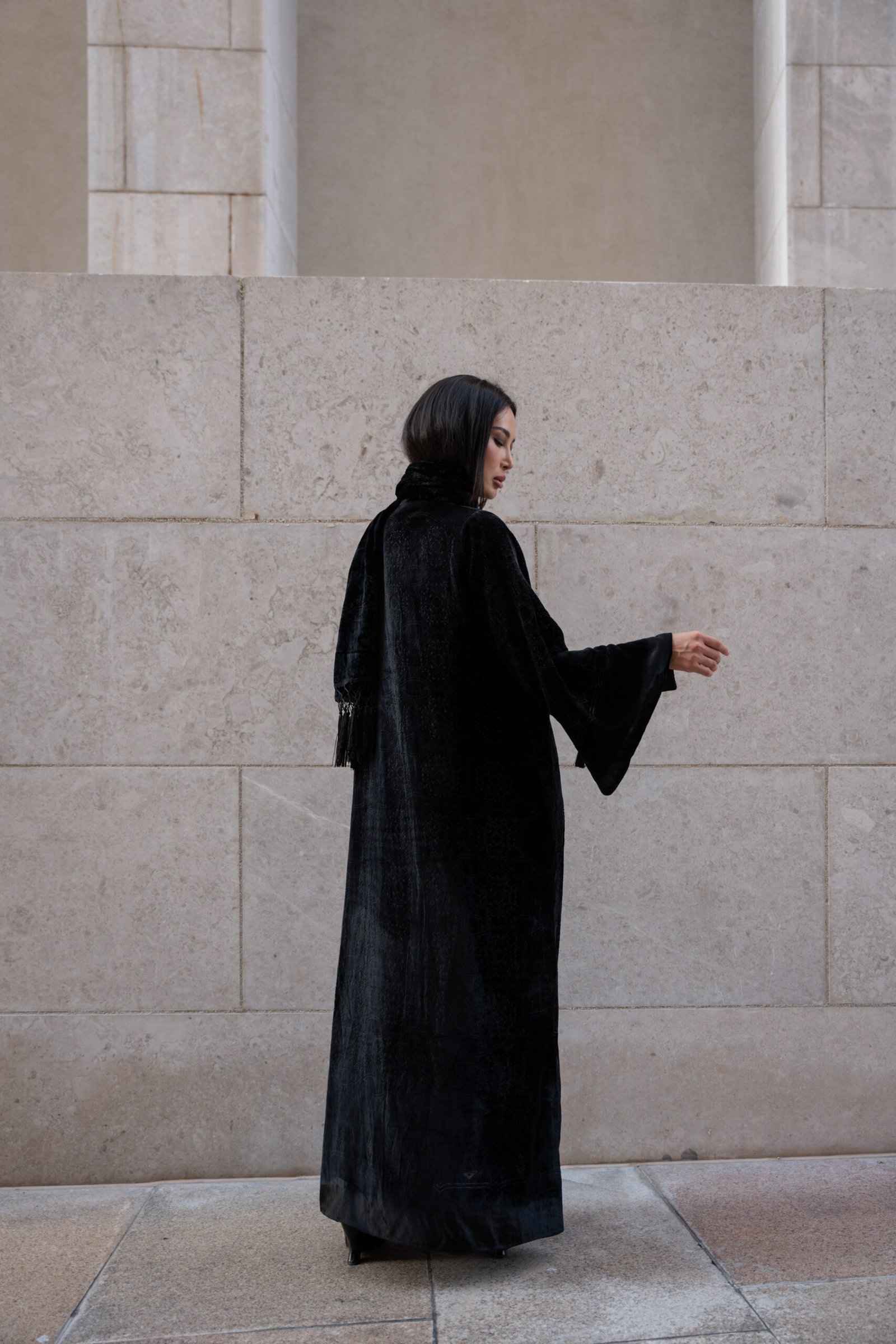 Designed in a flared silhouette, it flows gracefully with each movement while the details trace with tassels in the side slits and in front closure. and completed with matching velvet scarf with tassels. Making it an ideal choice for variety occasions.