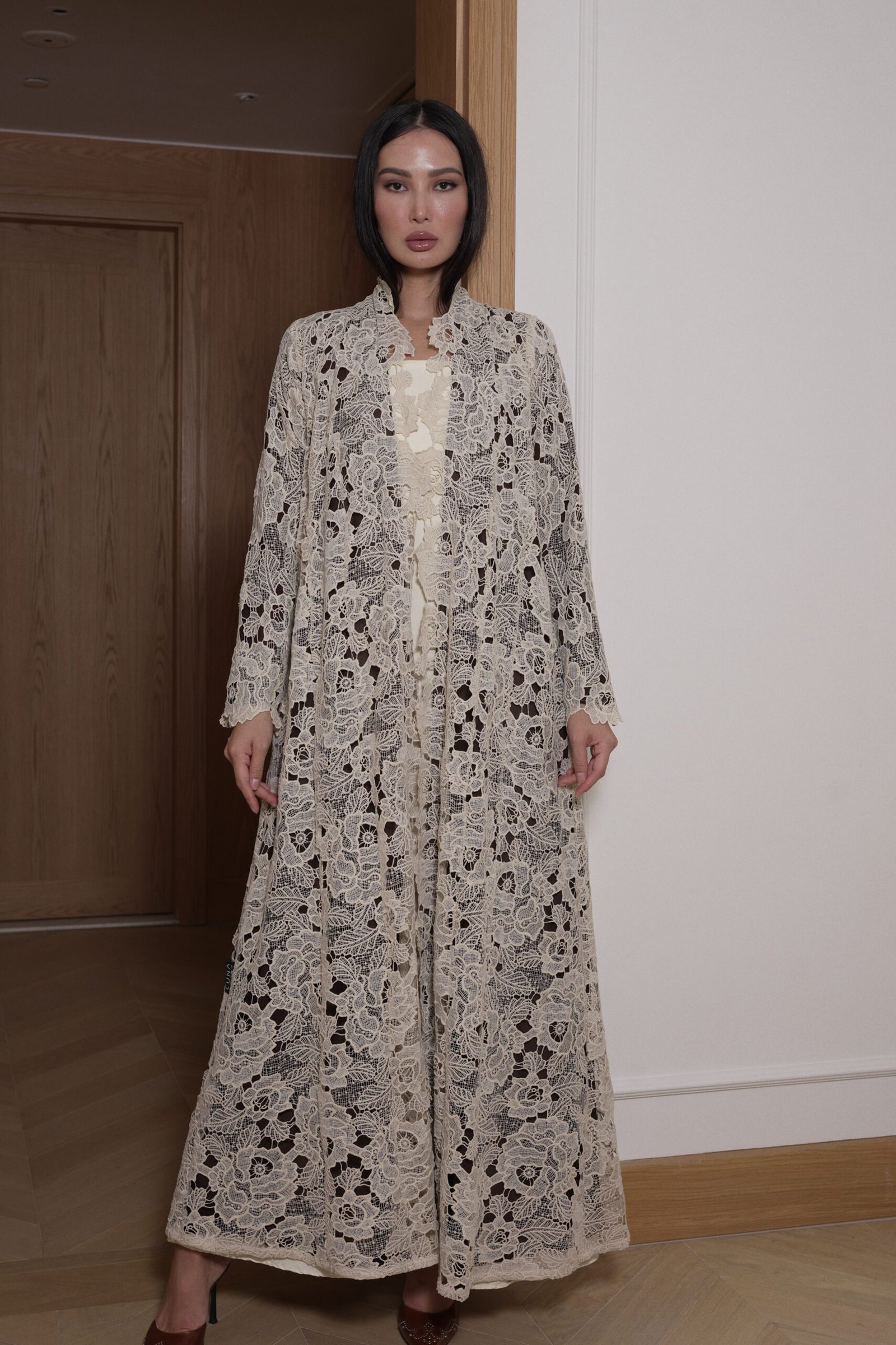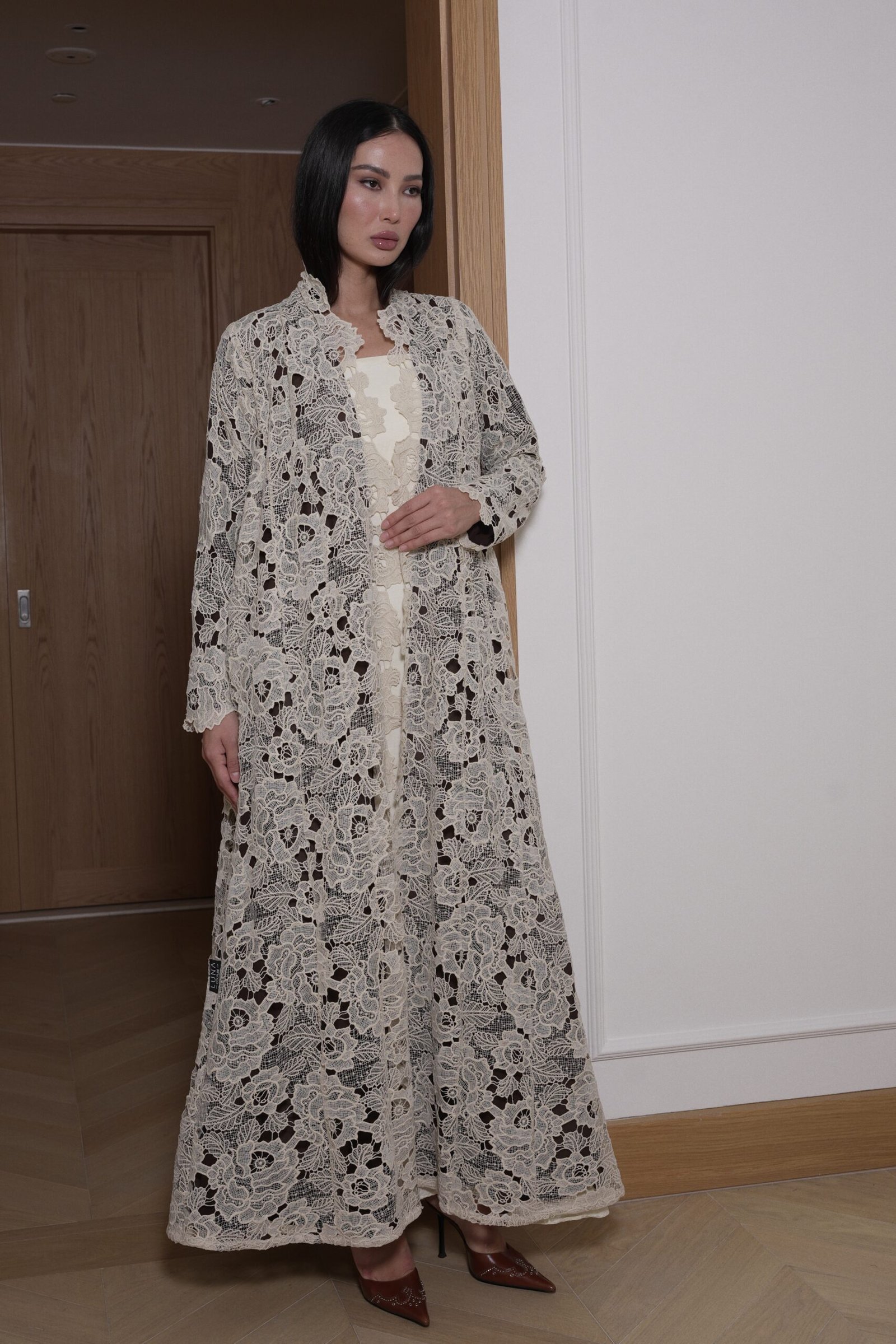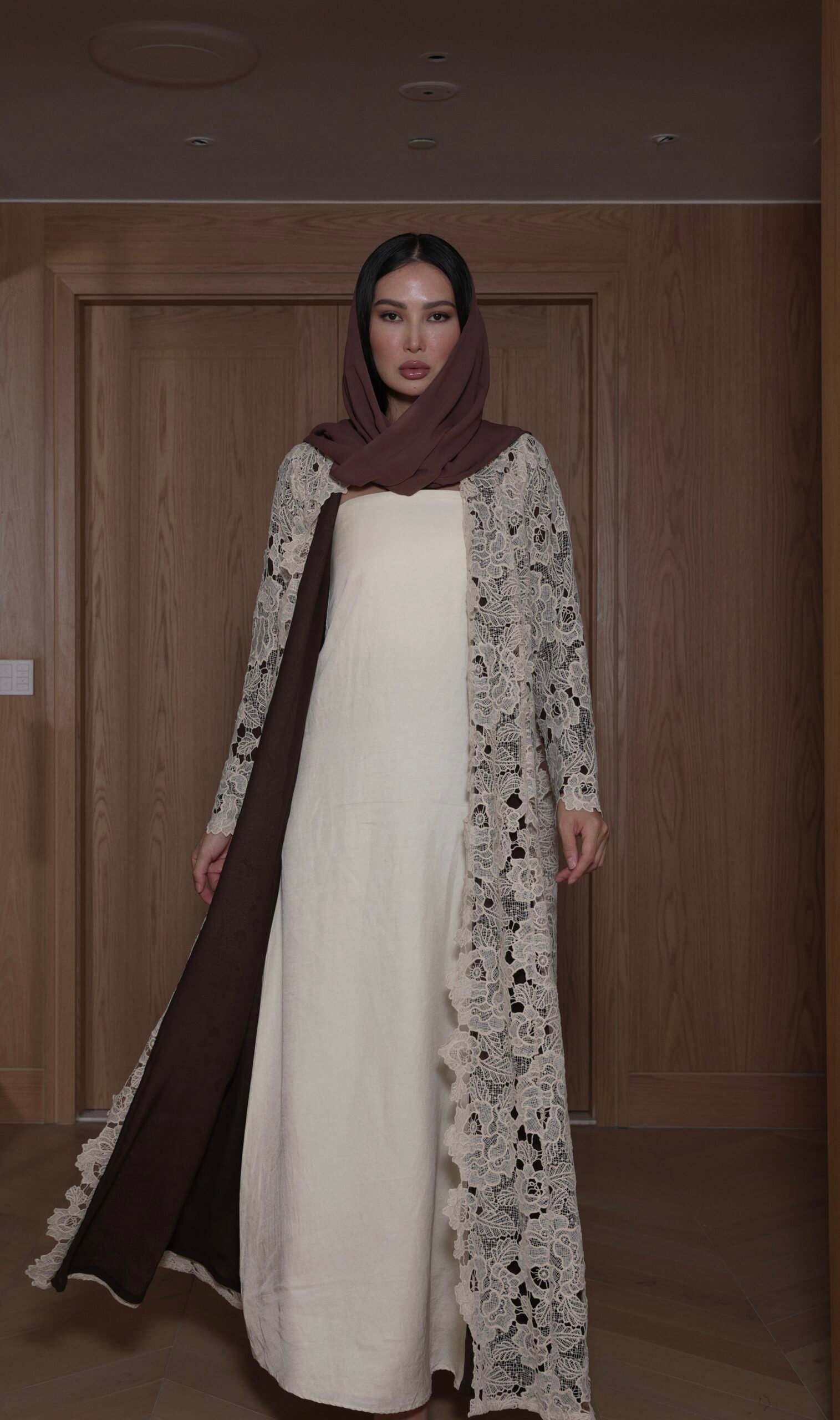 A semi cut abaya in beige lace with brown lining paired with a brown sheila crafted with an intricate floral lace outer layer, thoughtfully paired with a full inner lining for complete coverage and comfort. suitable for formal and special occasions.