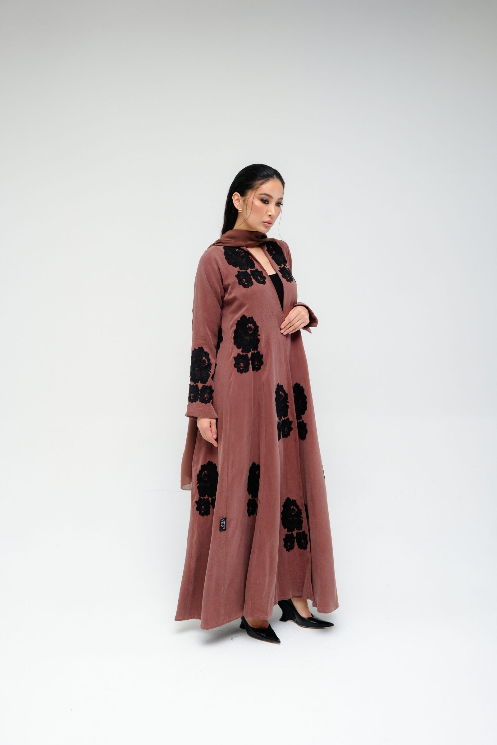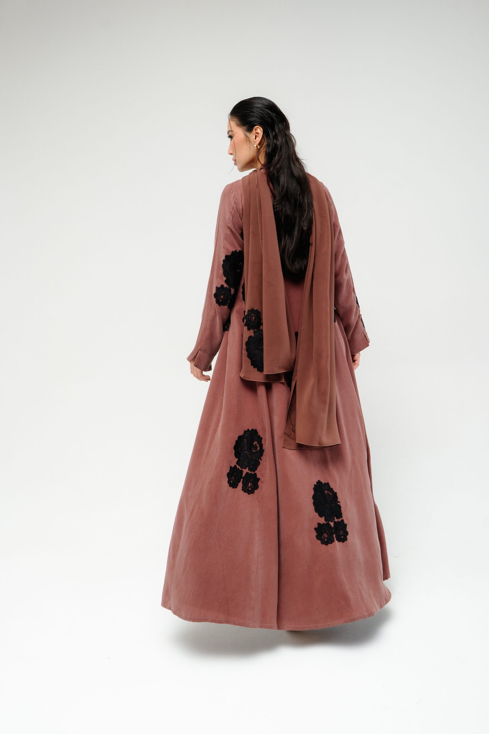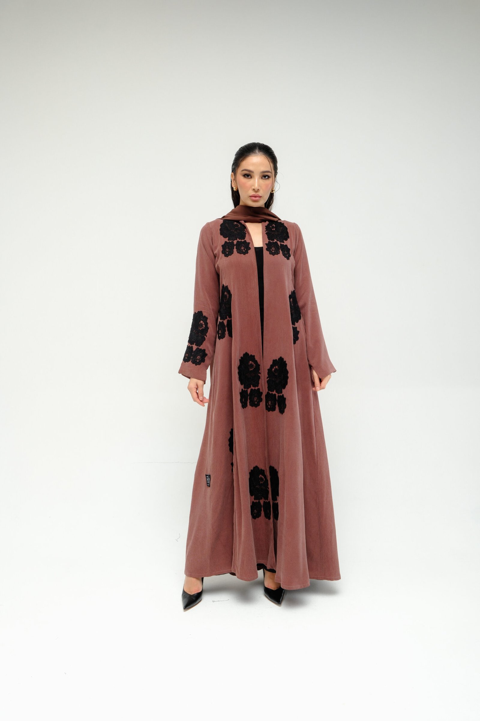 A-line abaya with a fitted waist and flared bottom, offering a flattering and elegant shape. Designed with intricate floral lace on the front, sleeves, and back. Paired with a matching sheila featuring lace accents for a soft, coordinated finish.
