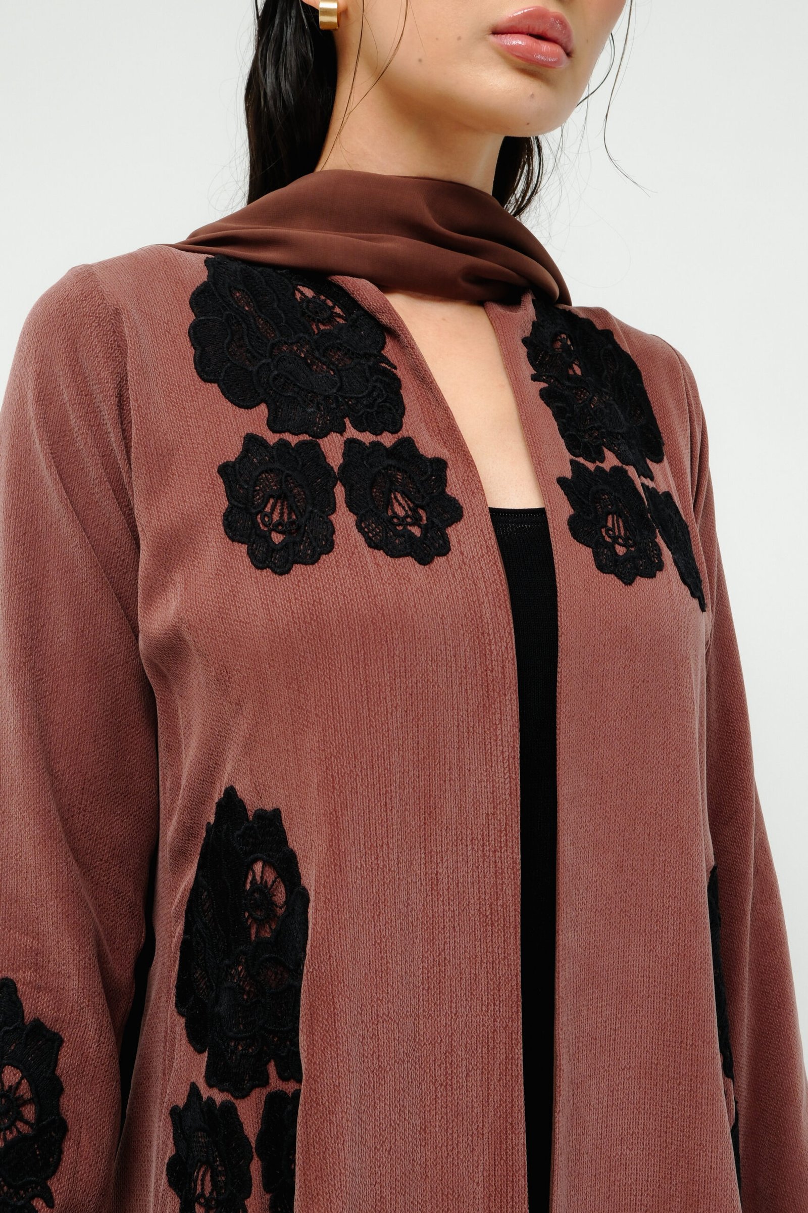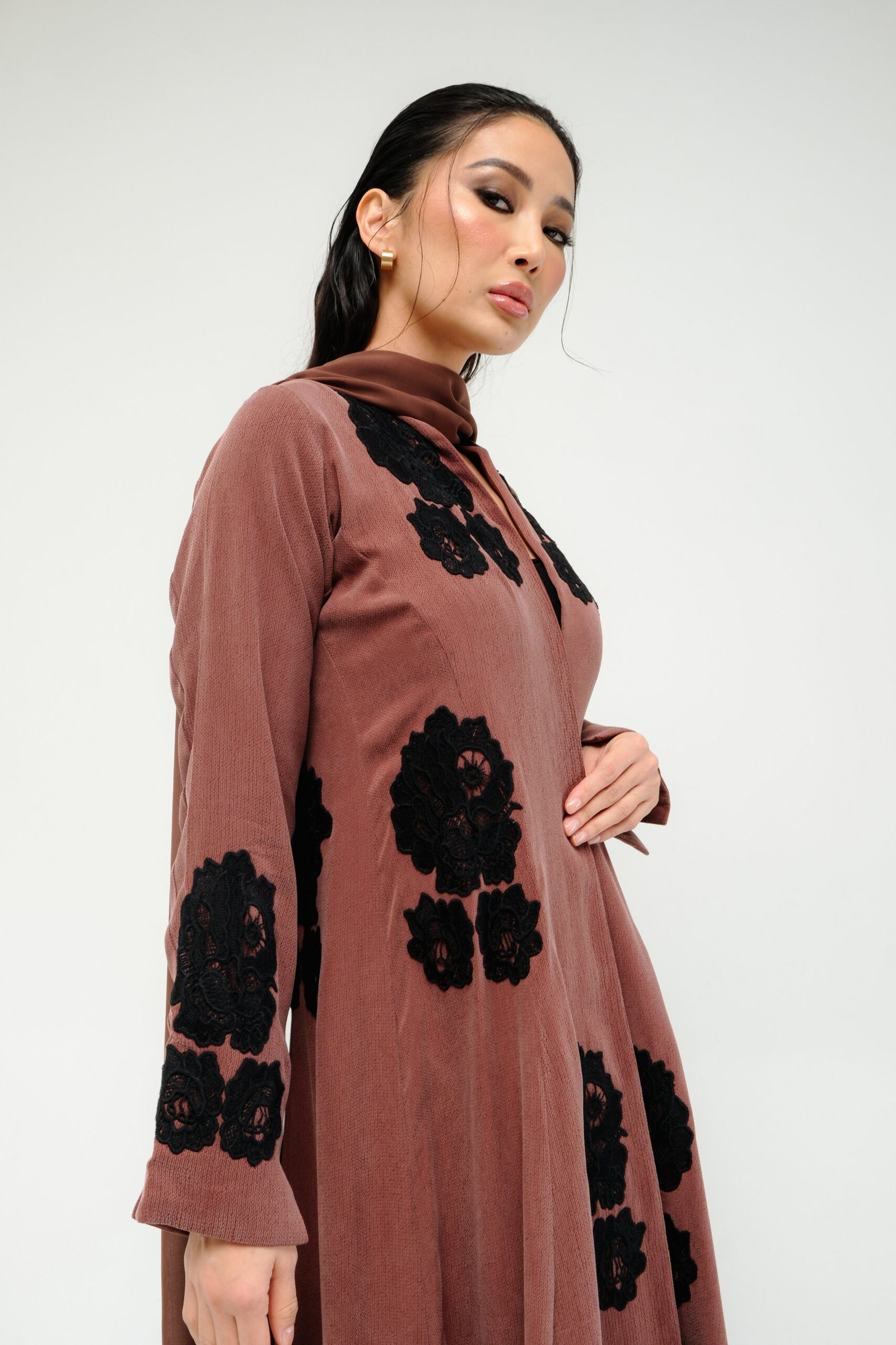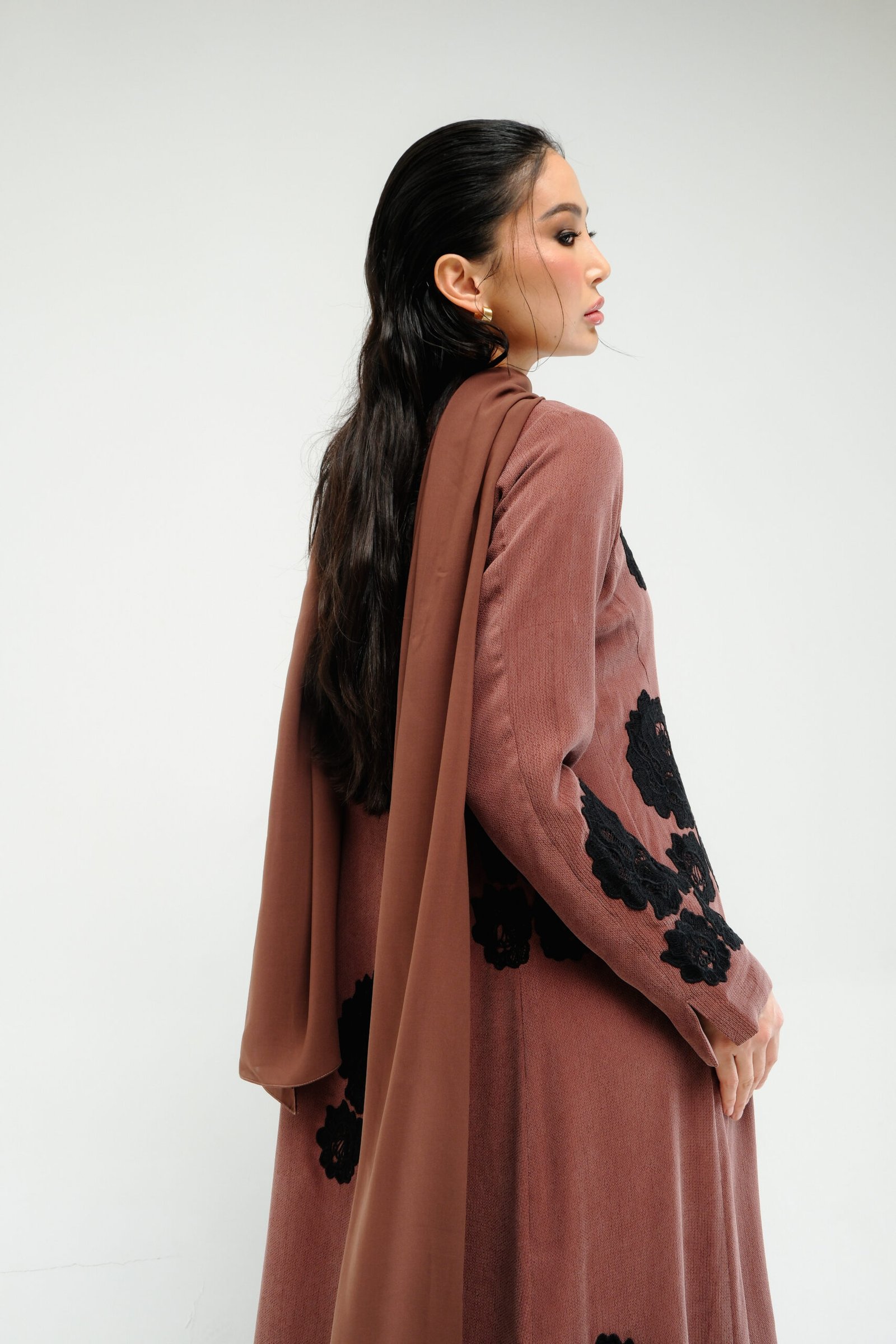 A-line abaya with a fitted waist and flared bottom, offering a flattering and elegant shape. Designed with intricate floral lace on the front, sleeves, and back. Paired with a matching sheila featuring lace accents for a soft, coordinated finish.