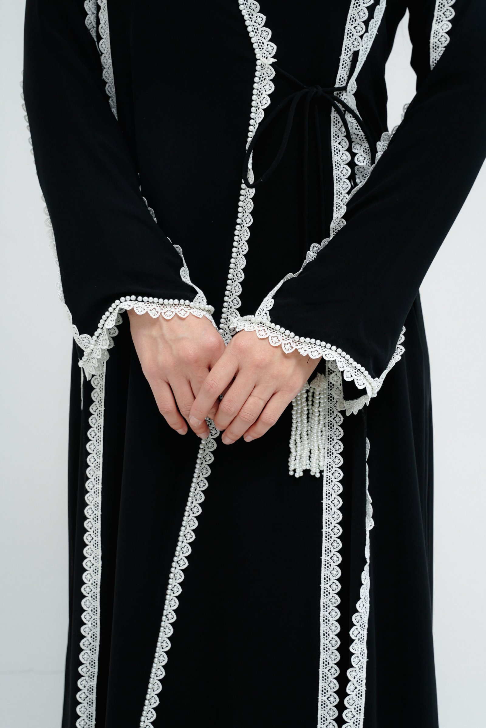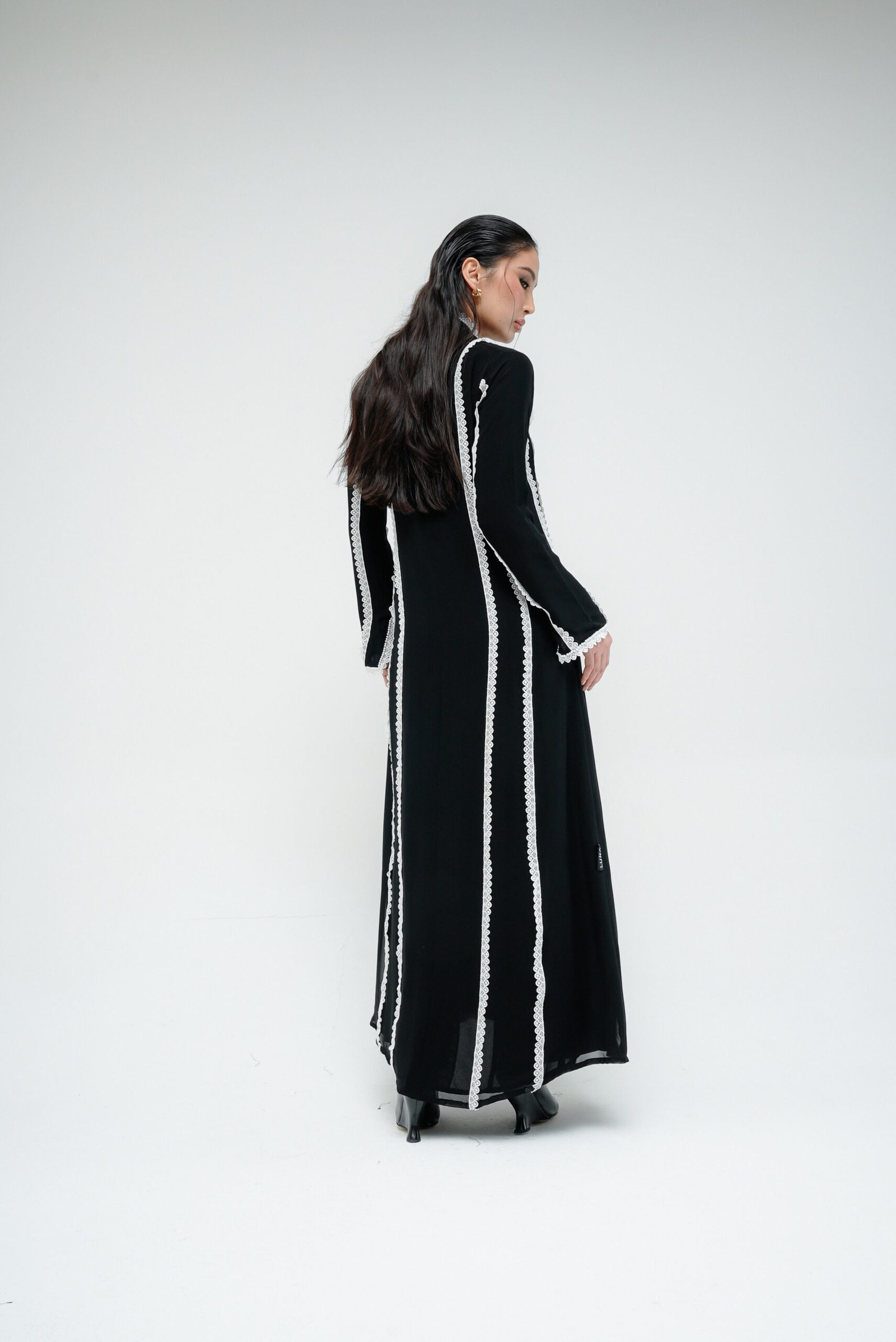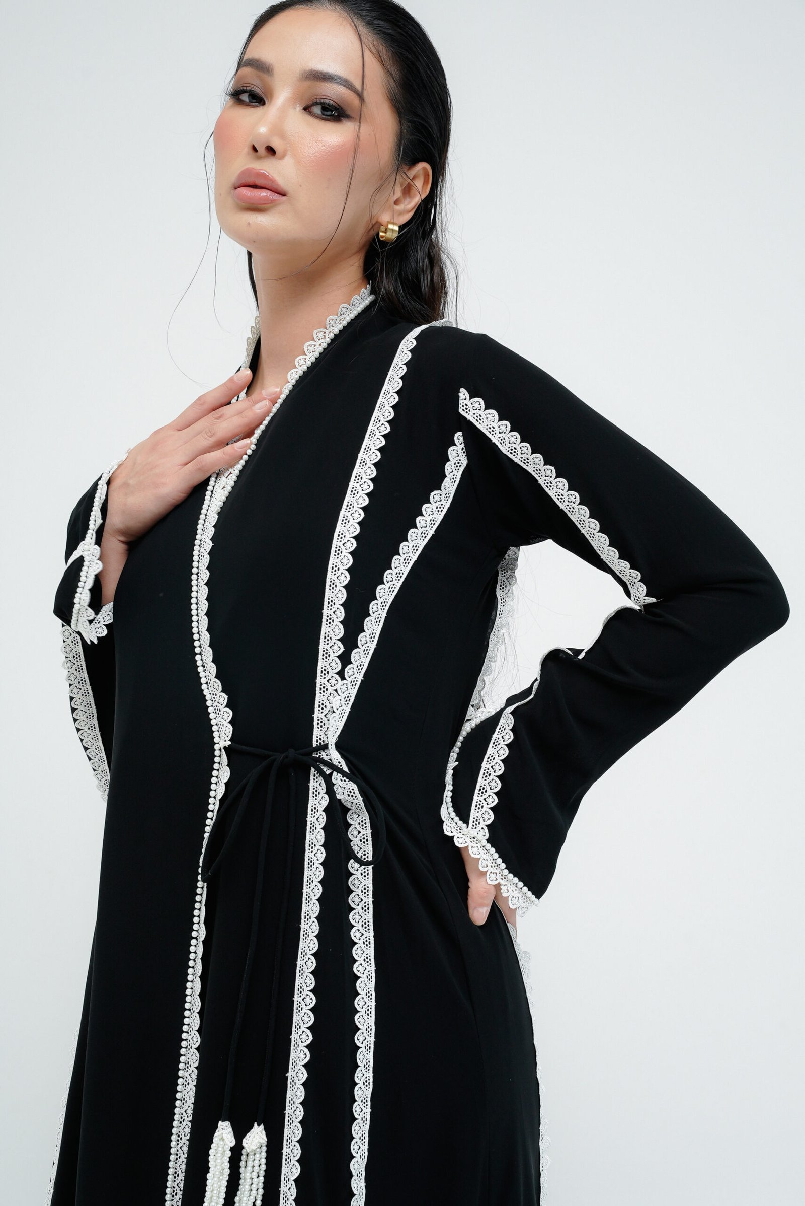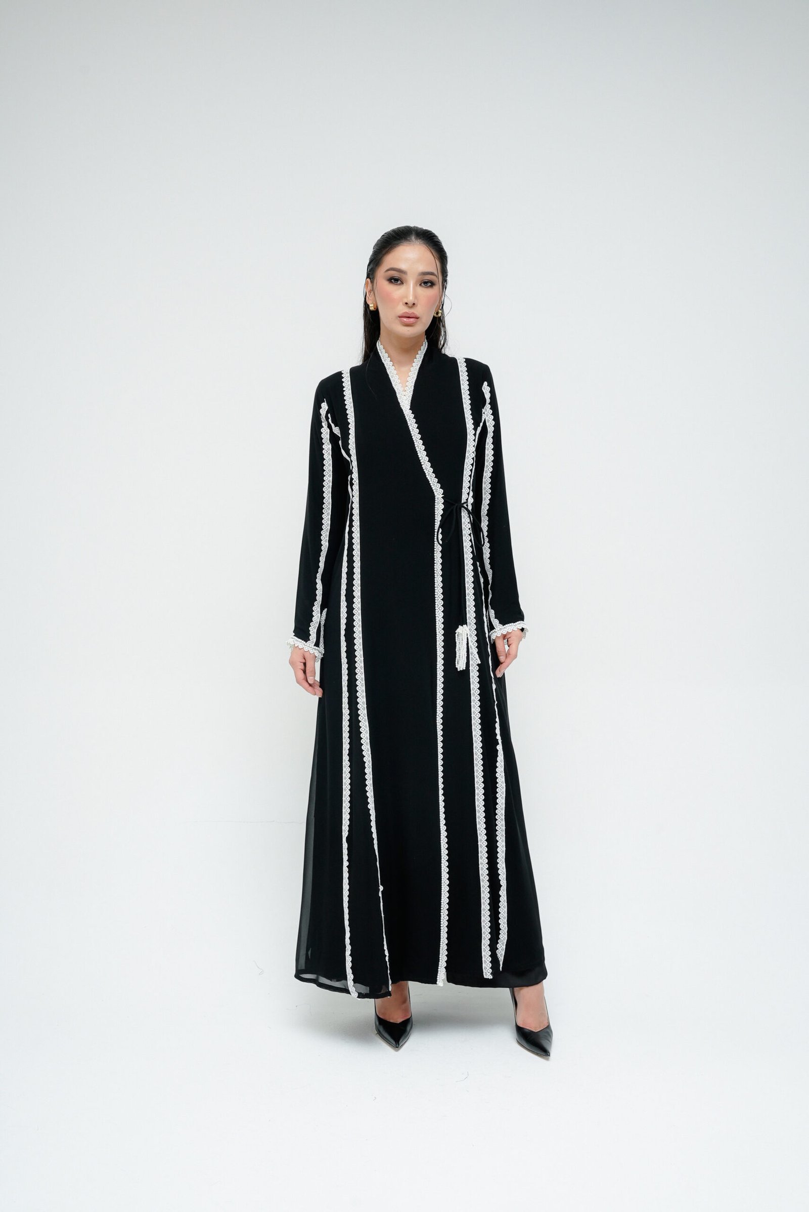 A refined overlap-cut abaya in black chiffon, adorned with delicate white lace along the front and sleeves. Accented with subtle white pearls, this piece strikes the perfect balance between timeless elegance and contemporary detail.