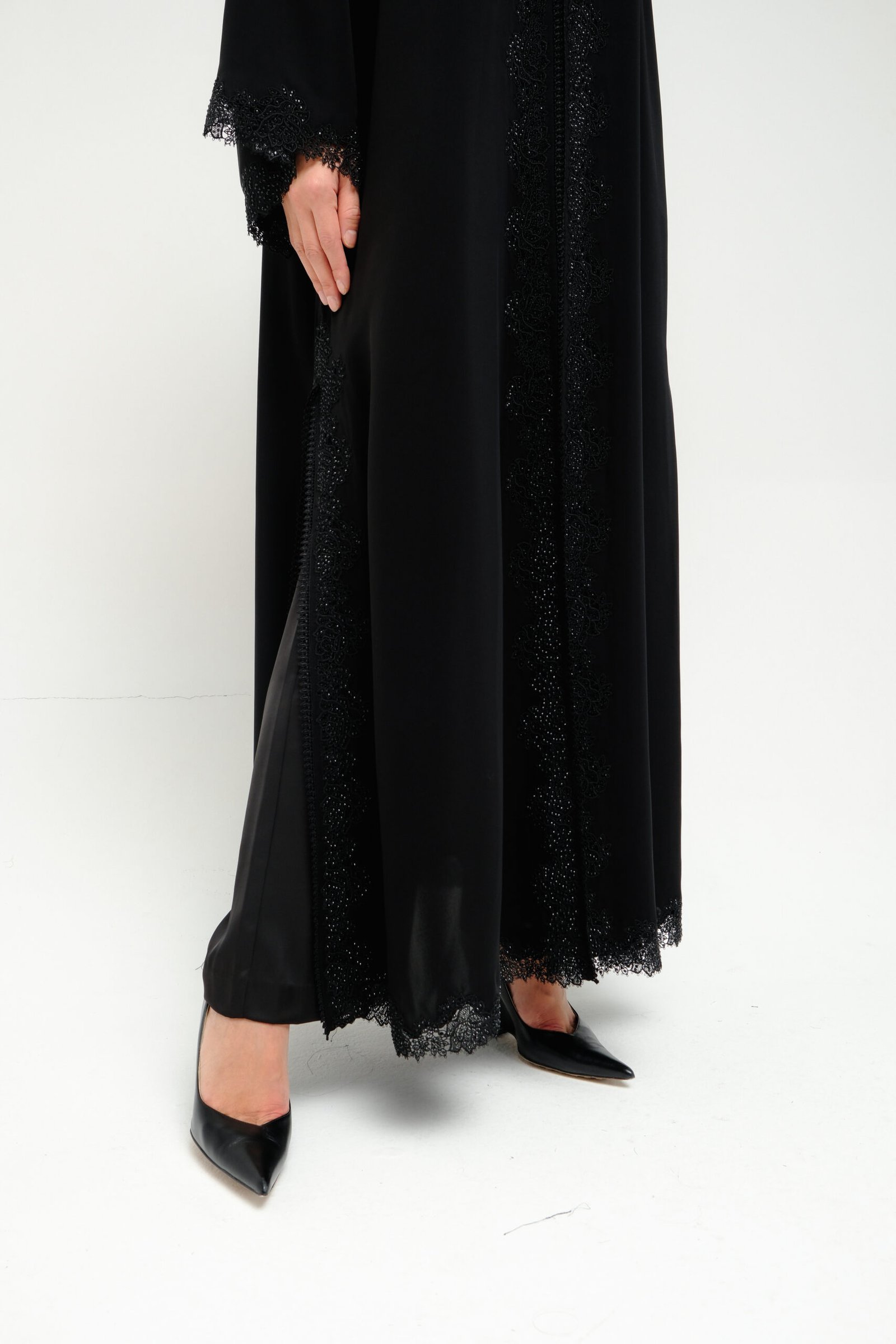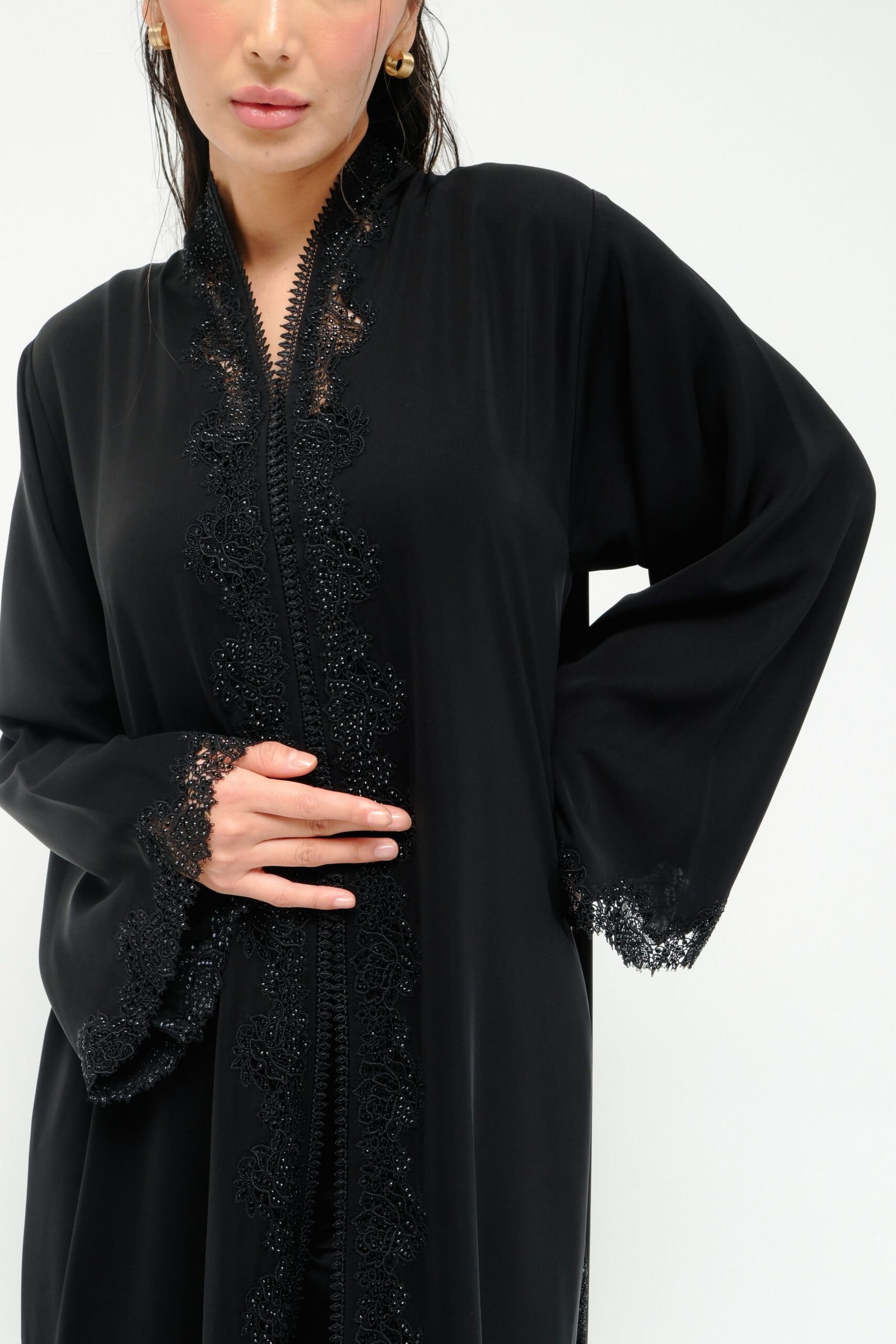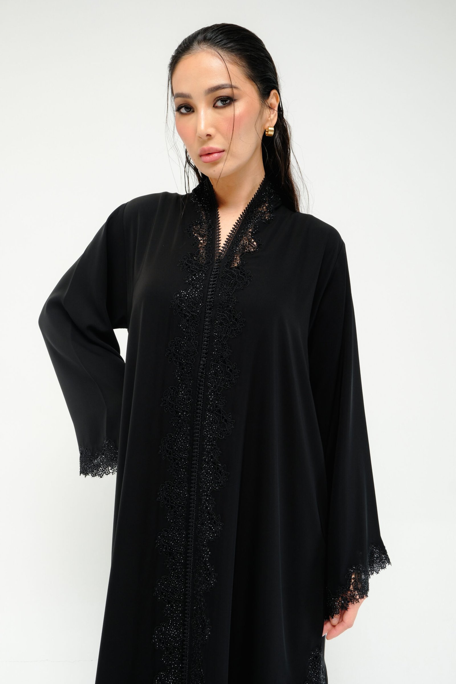 A straight-cut abaya in airy light silk, elevated with intricate black lace and delicate rhinestone accents across the front, side slits, and sleeves. A graceful blend of shimmer and sophistication.