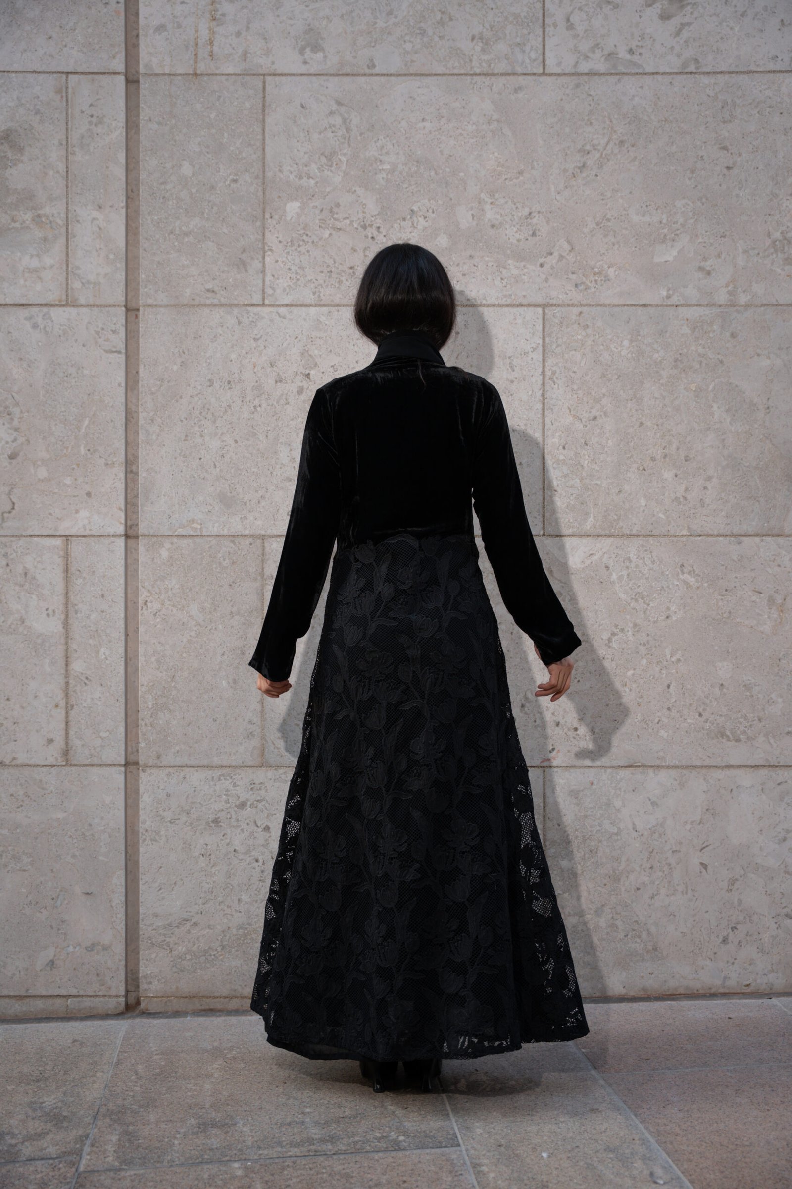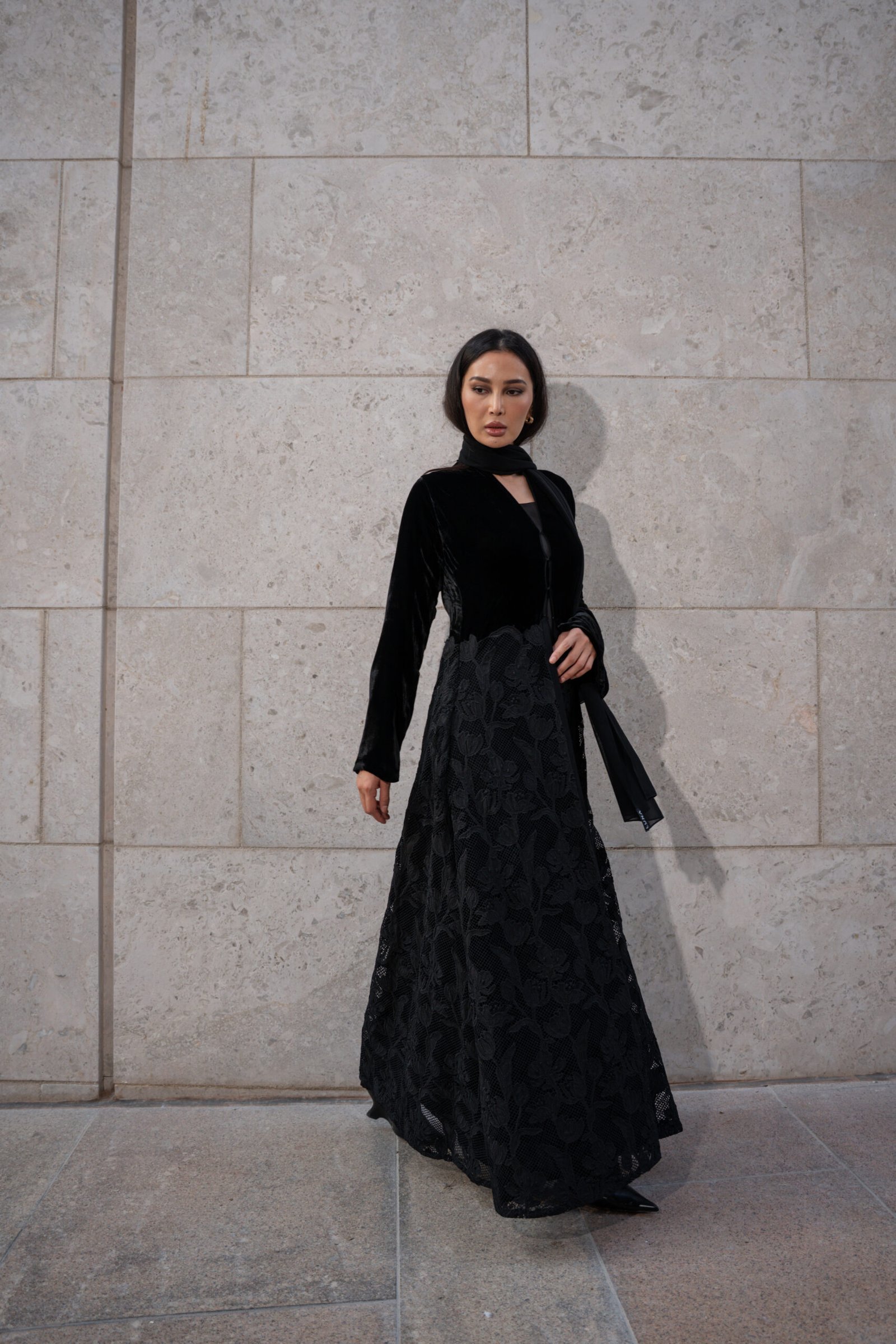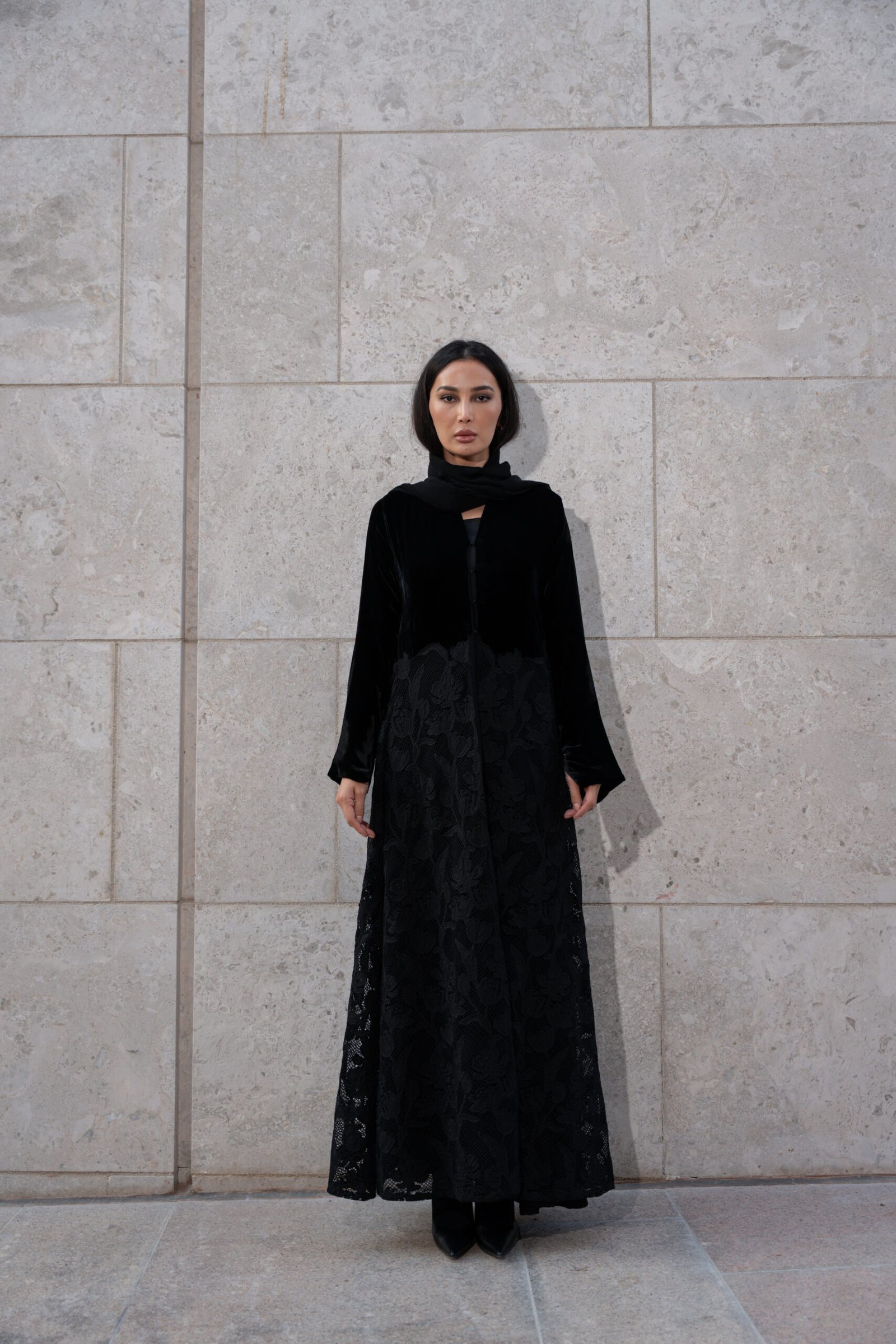 This abaya is a masterful blend of contrasting textures in a single, timeless color, making it an exquisite piece of contemporary evening wear. The silhouette is defined by an A-line curved cut.The velvet ends near the natural waist, and the lace skirt flares out slightly from that point, creating a feminine curve and excellent movement.