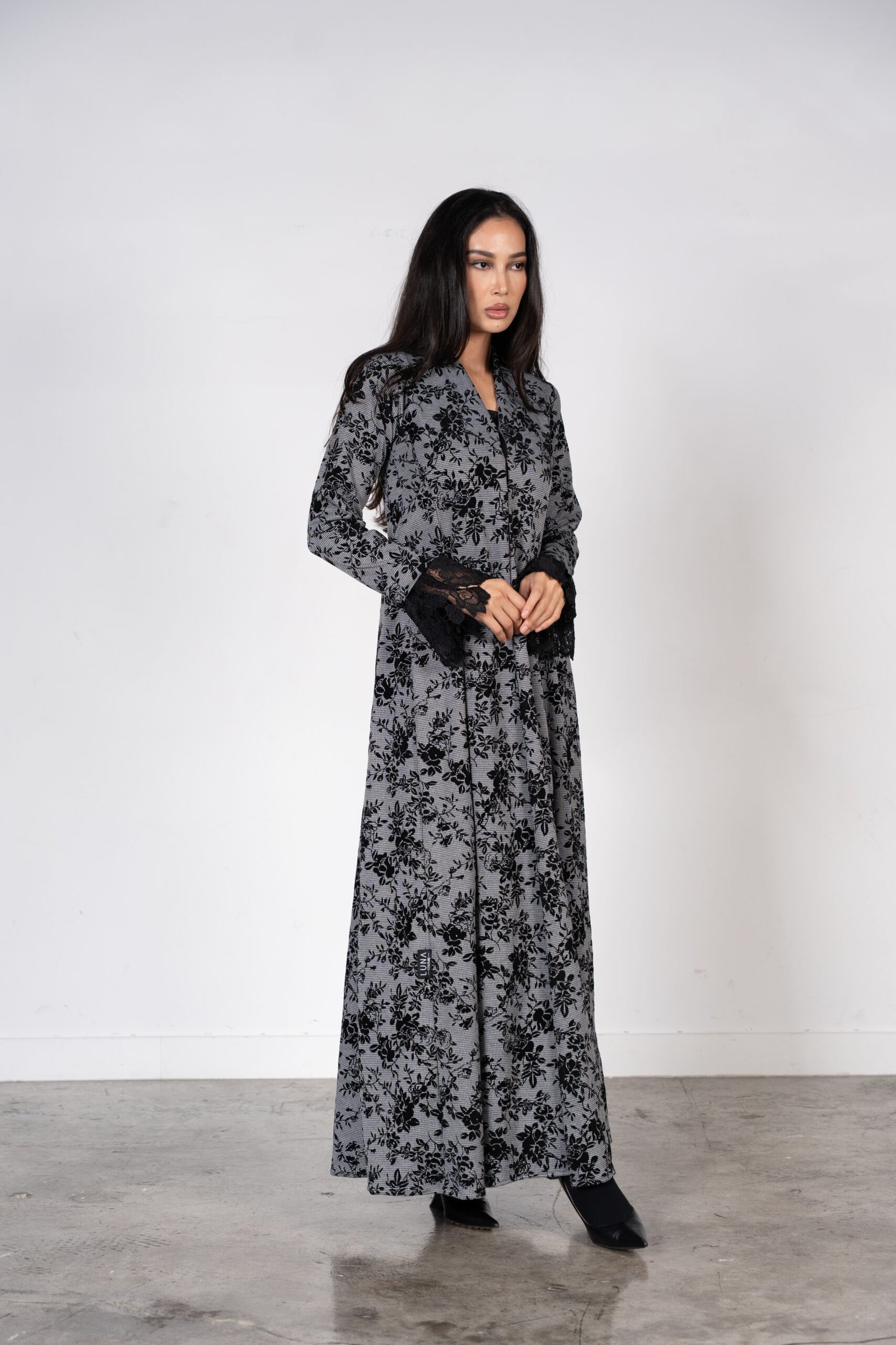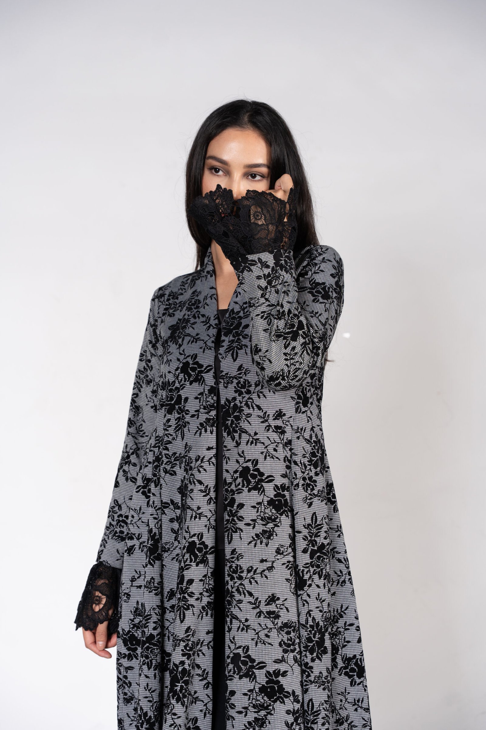A modern open abaya made from a fabric featuring an all-over gray and black micro check/tartan pattern overlaid with a bold black floral print. it is styled with black lace cuffs.