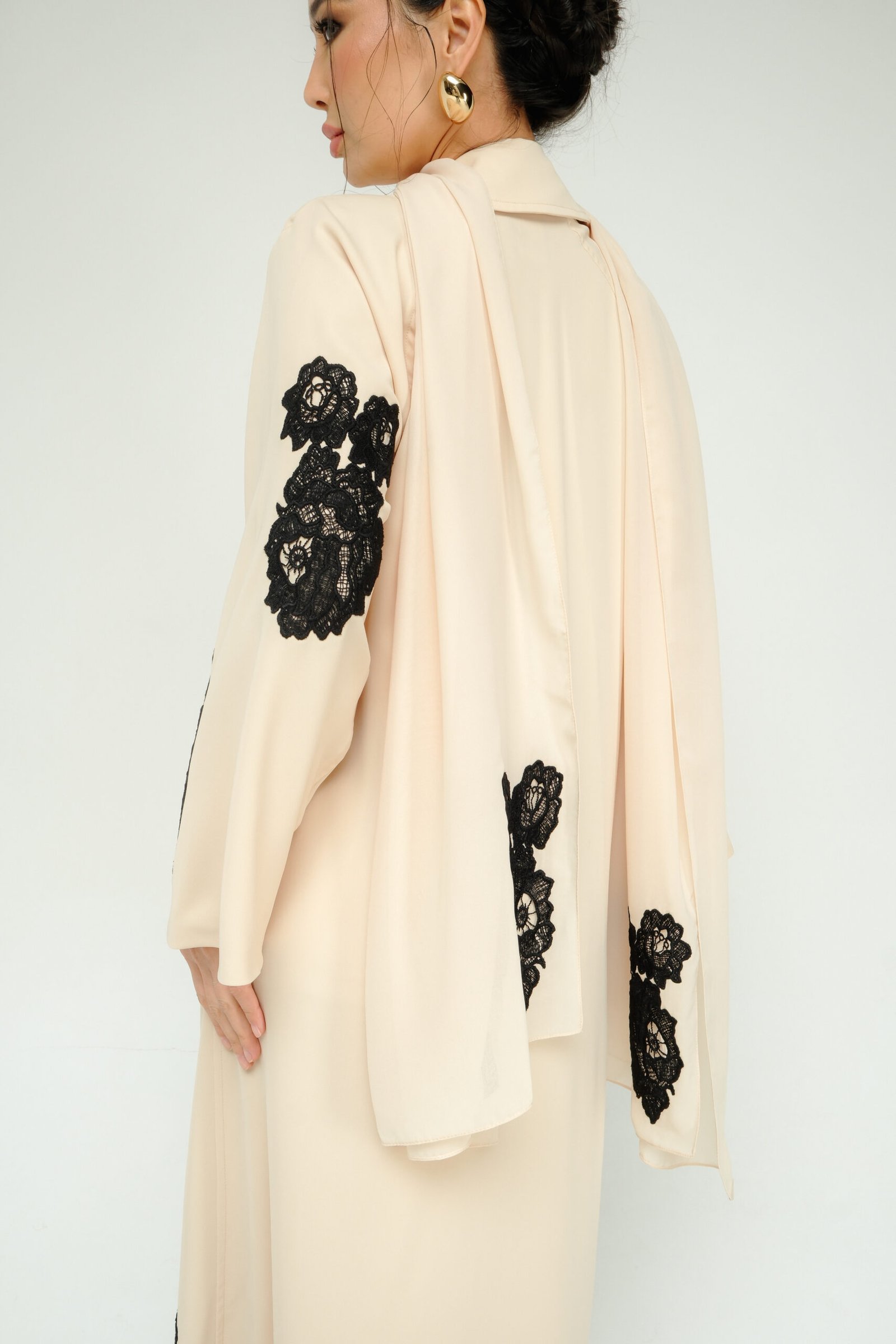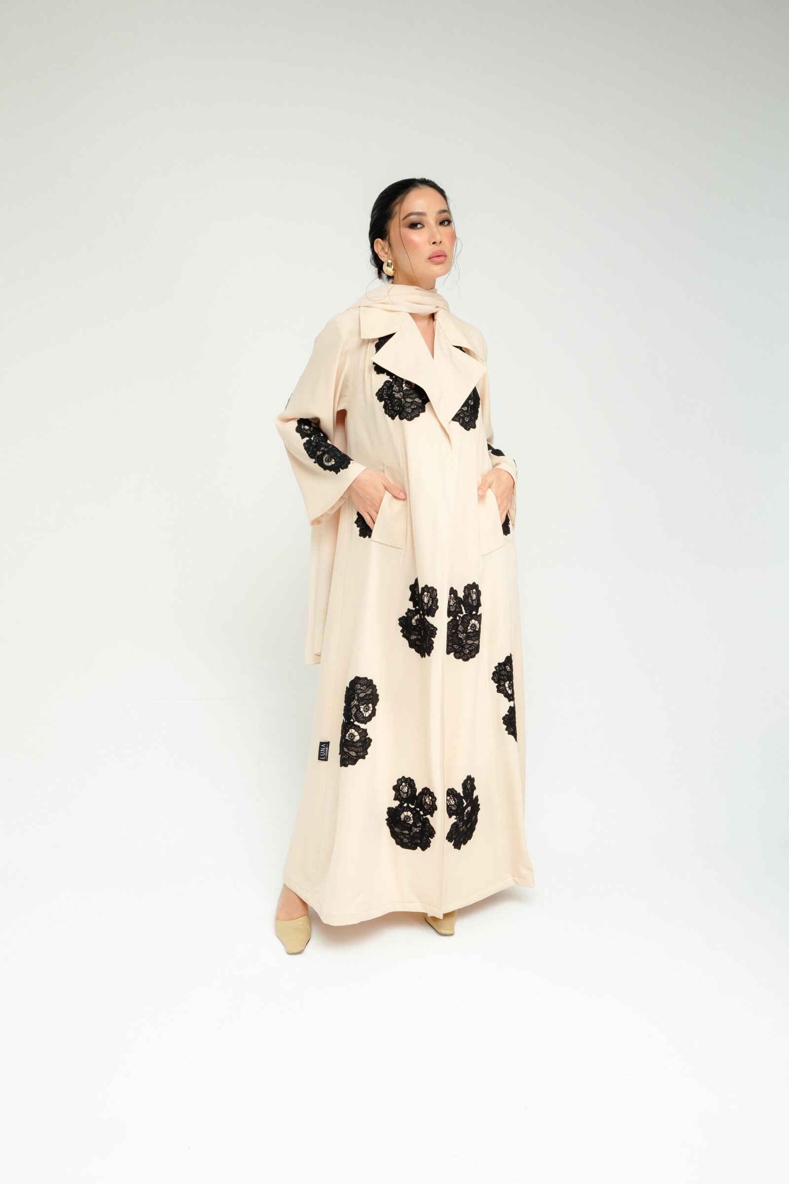 Trench coat-style abaya in crepe, featuring an oversized lapel collar and all-over floral lace detailing. A modern silhouette with a touch of femininity, perfect for both formal and elevated everyday wear.