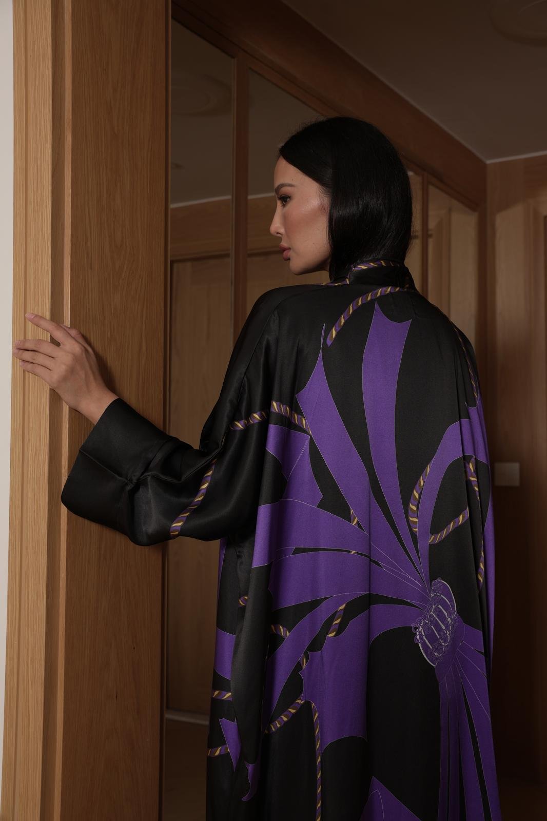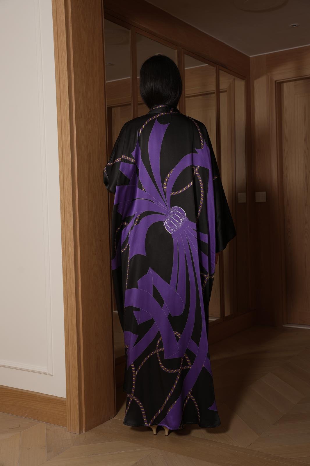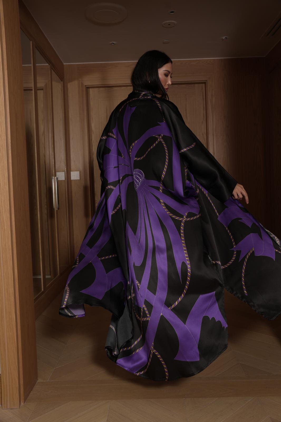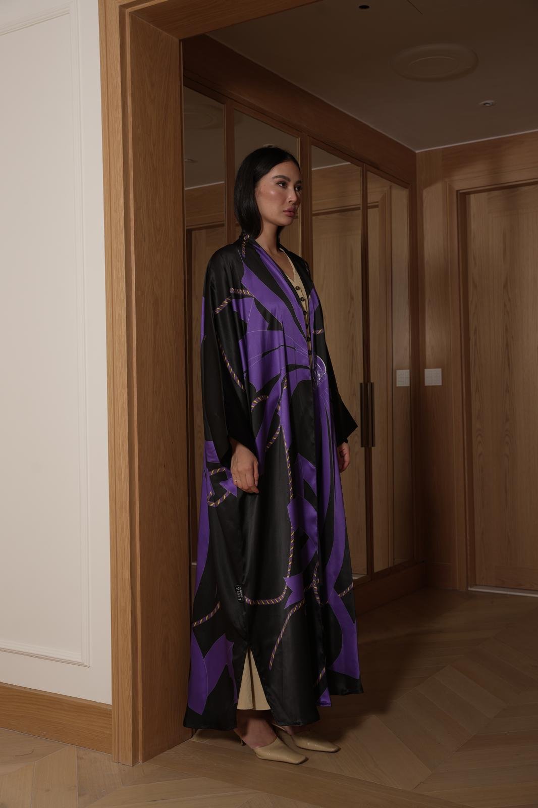 T-CUT BLACK SILK ABAYA WITH SIDE SLITS AND WIDE SLEVEES, ITS DETAILED WITH BOLD PURPLE ABSTRACT PRINTS, FLOWING IN A RELAXED SILHOUETTE FOR A MODERN, ARTISTIC ELEGANCE.