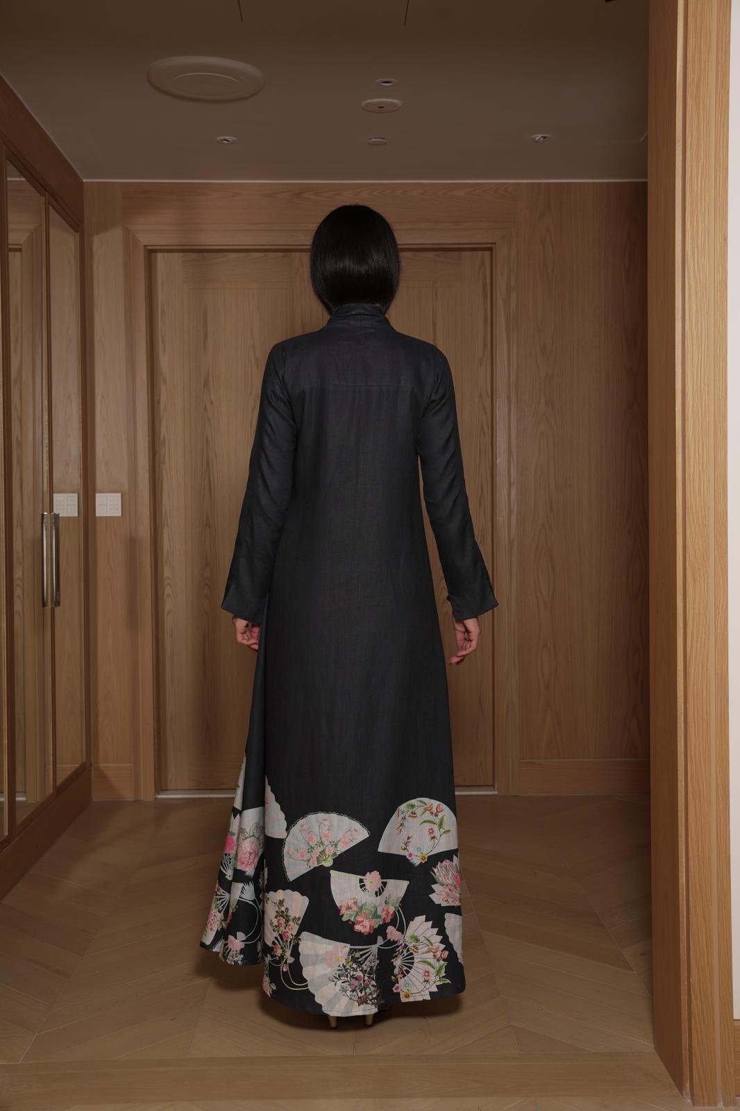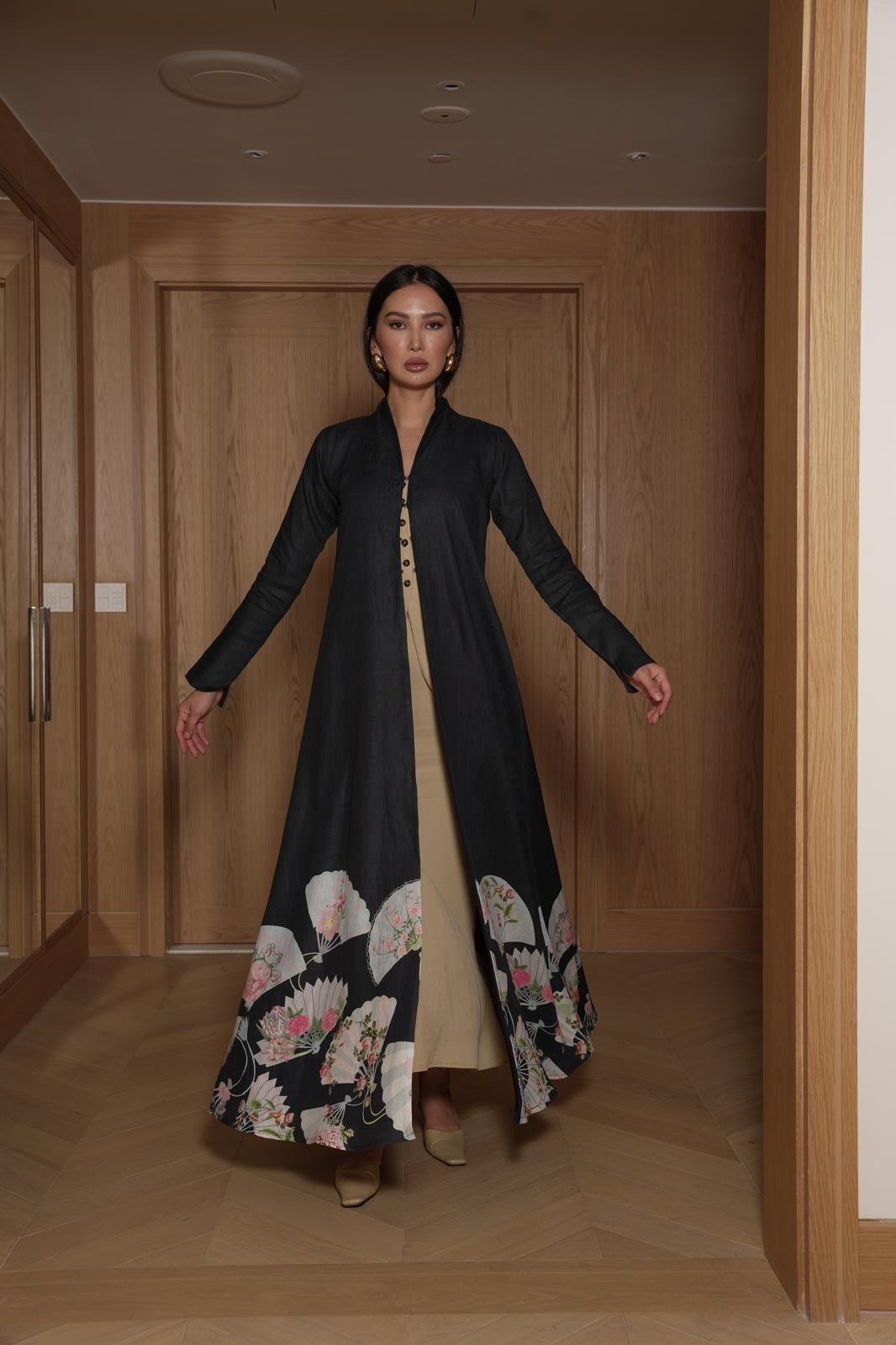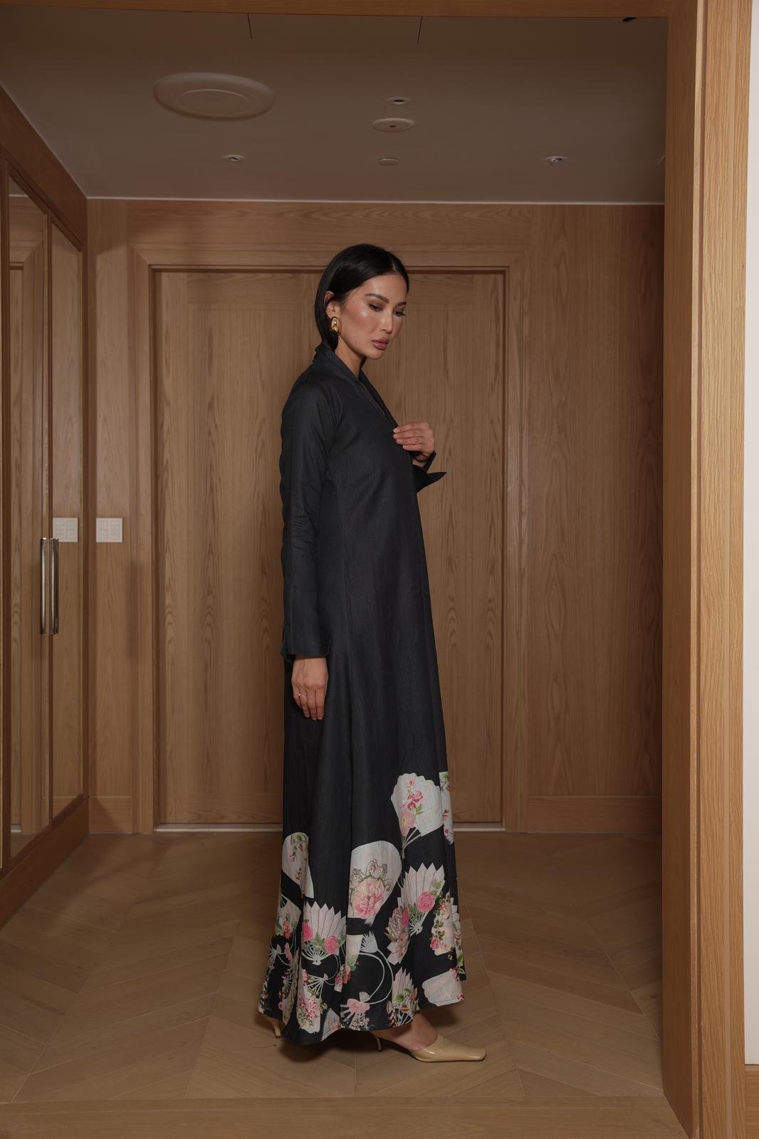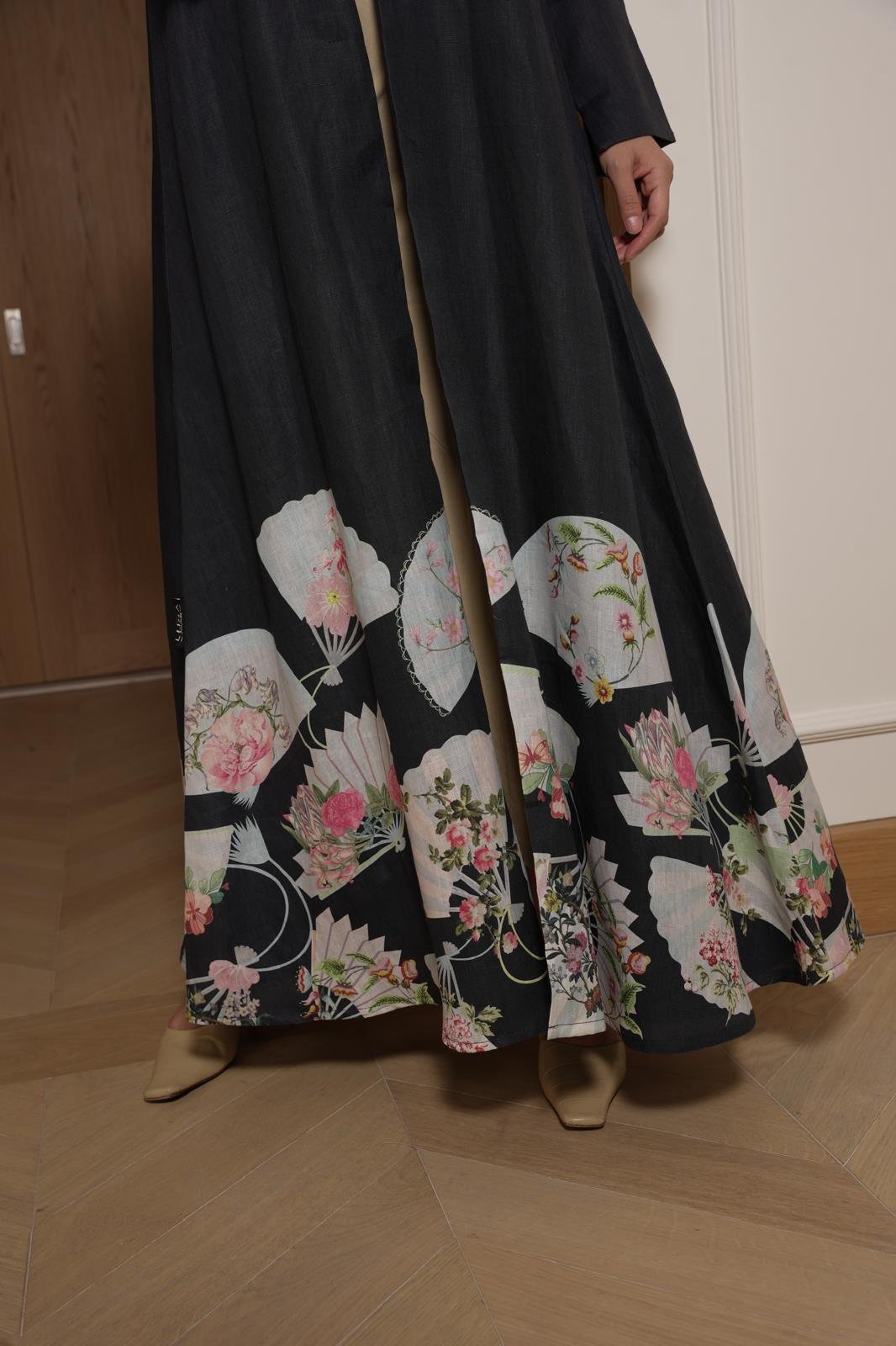 A-CUT LINEN ELEGANT ABAYA WITH A SLEEK, FLOWING SILHOUETTE, ELEVATED BY A DELICATE FLORAL PRINTED HEM FOR A REFINED AND FEMININE TOUCH.