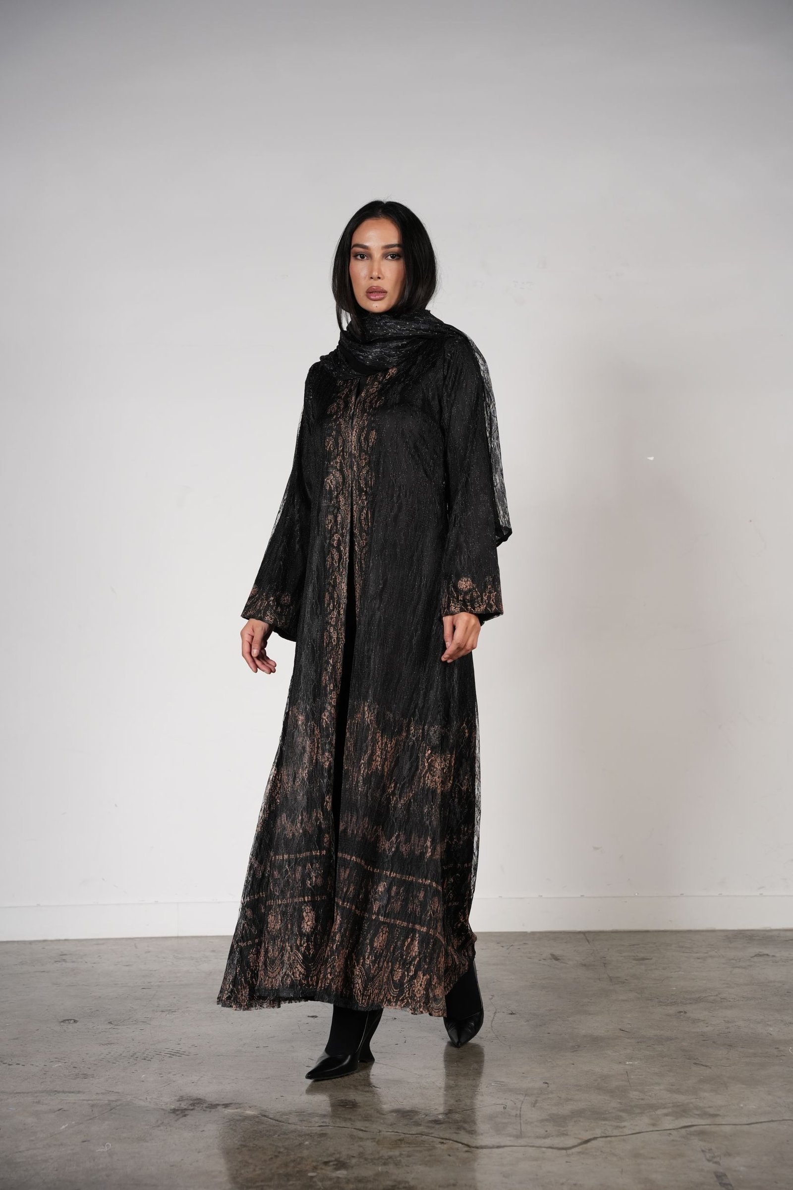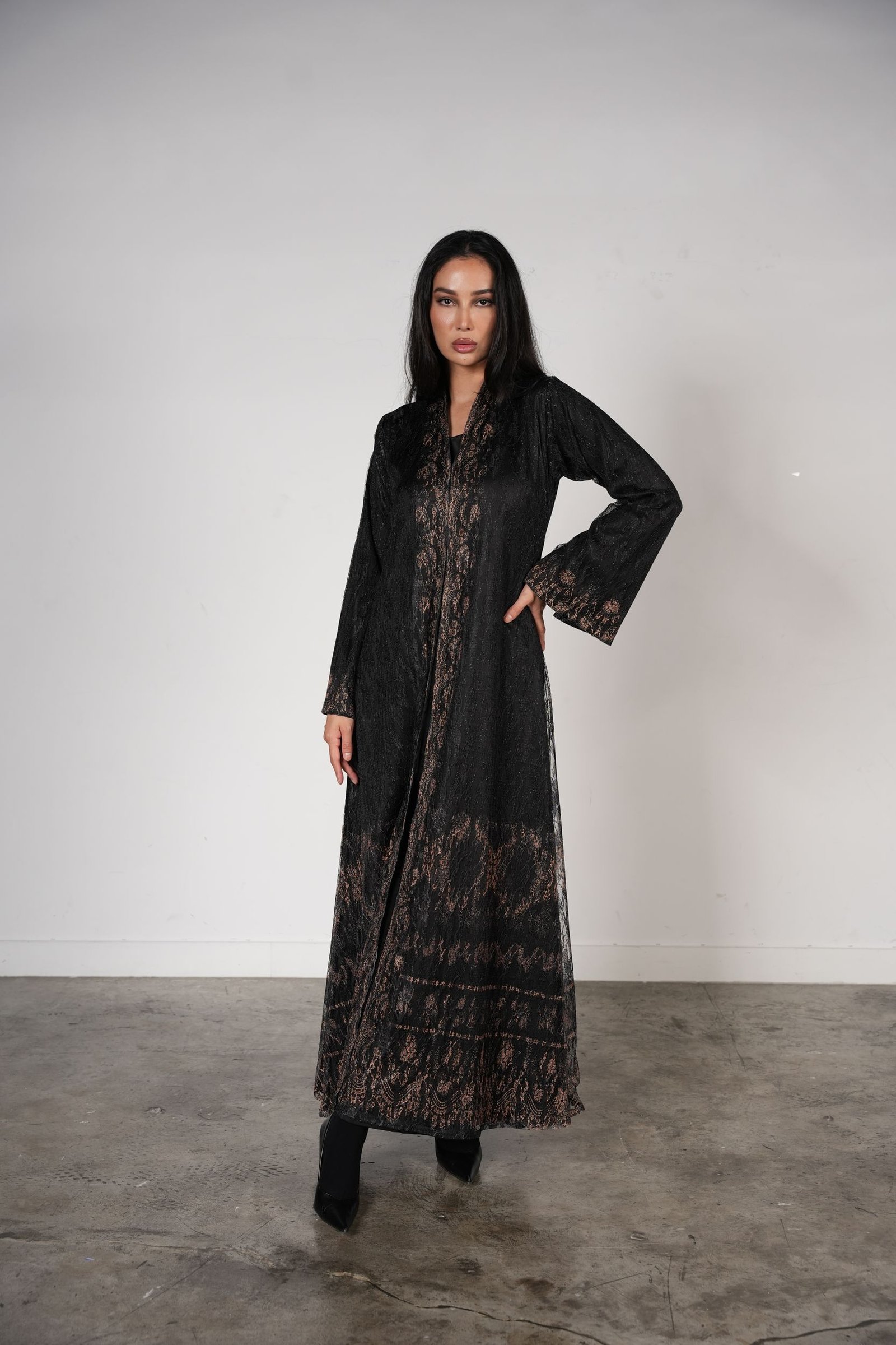 An A-line lace abaya with