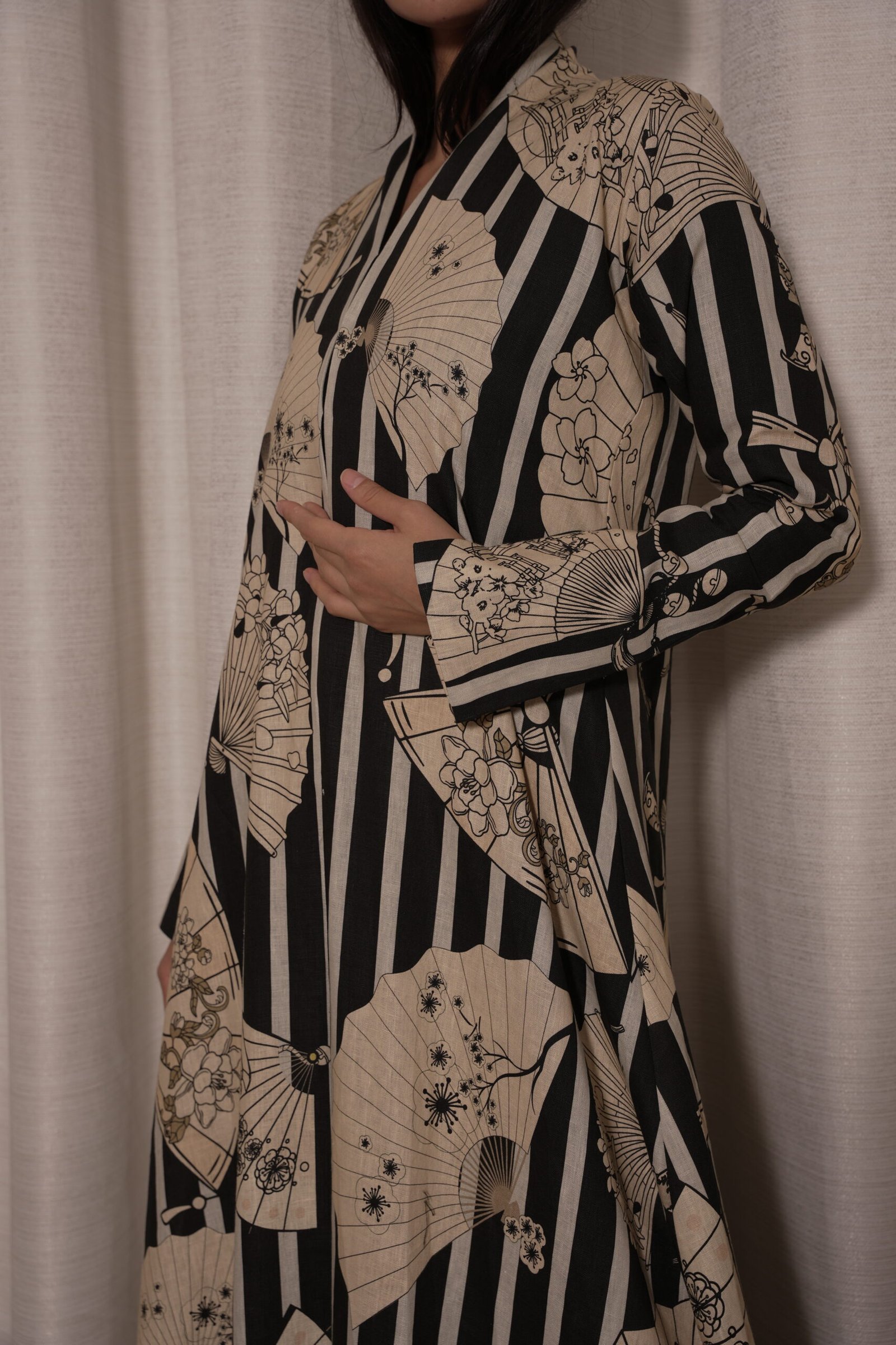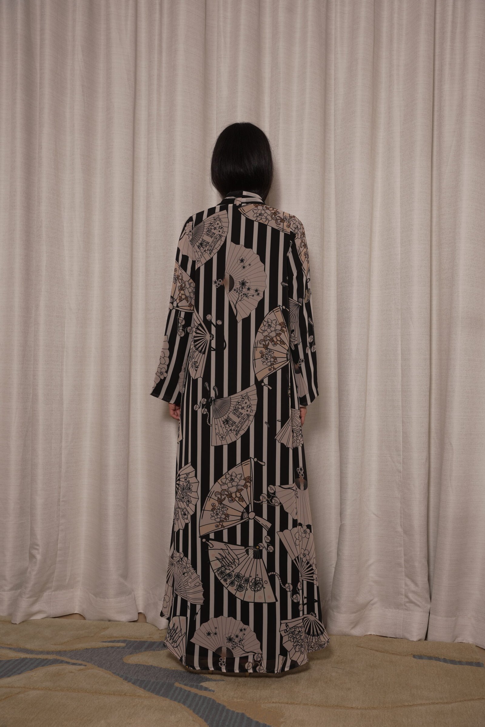 A-line linen abaya features a graceful flared silhouette that drapes beautifully with movement. Designed with an elegant fan print over vertical stripes, it creates a striking balance between structure and fluidity. The breathable linen fabric ensures comfort, while the subtle front hook closure provides a clean, refined finish.