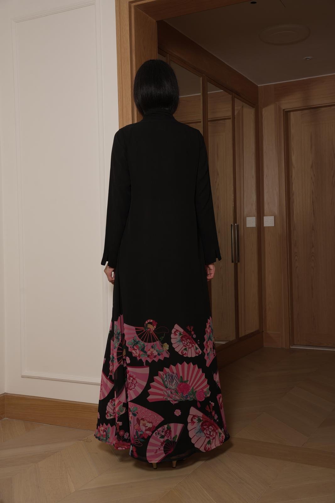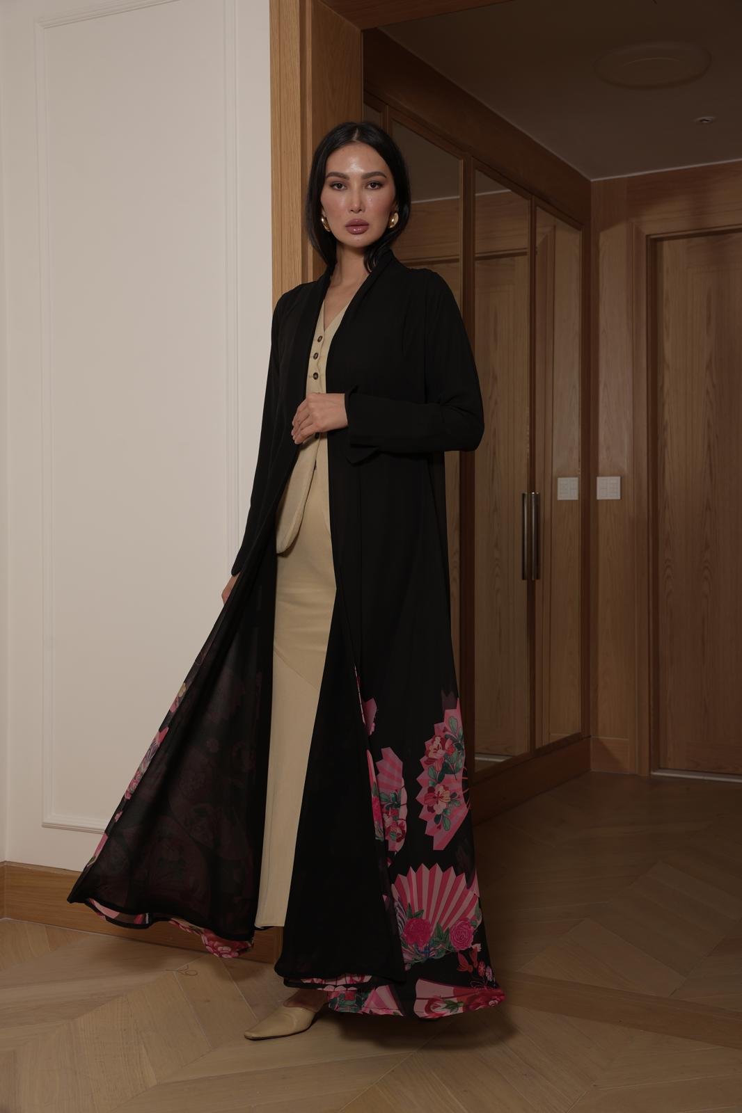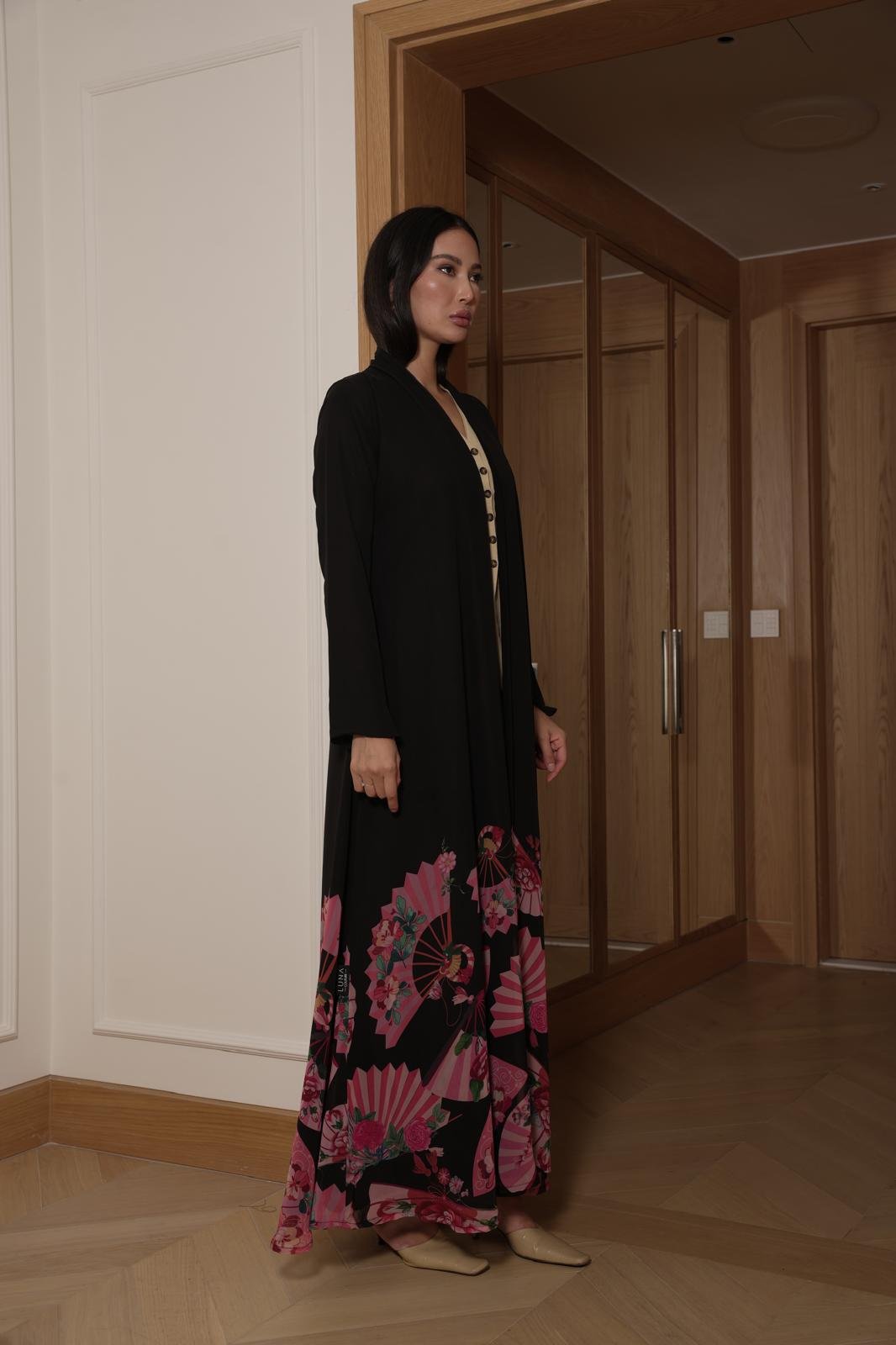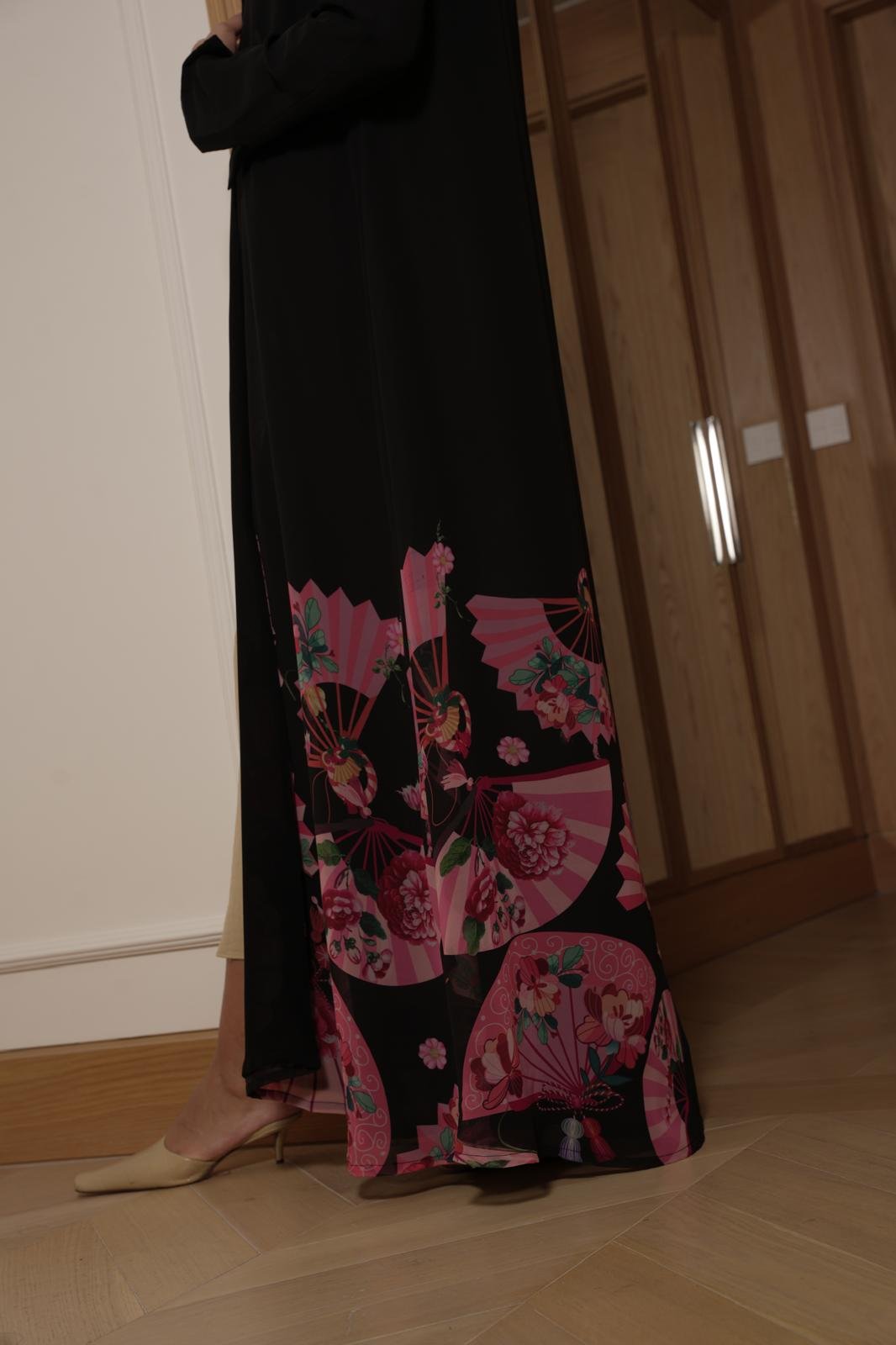 A-LINE CUT BLACK CHIFFON ABAYA, FEATURING A VIBRANT PINK FAN PRINT ALONG THE HEM FOR A SOPHISTICATED, CULTURAL FLAIR.