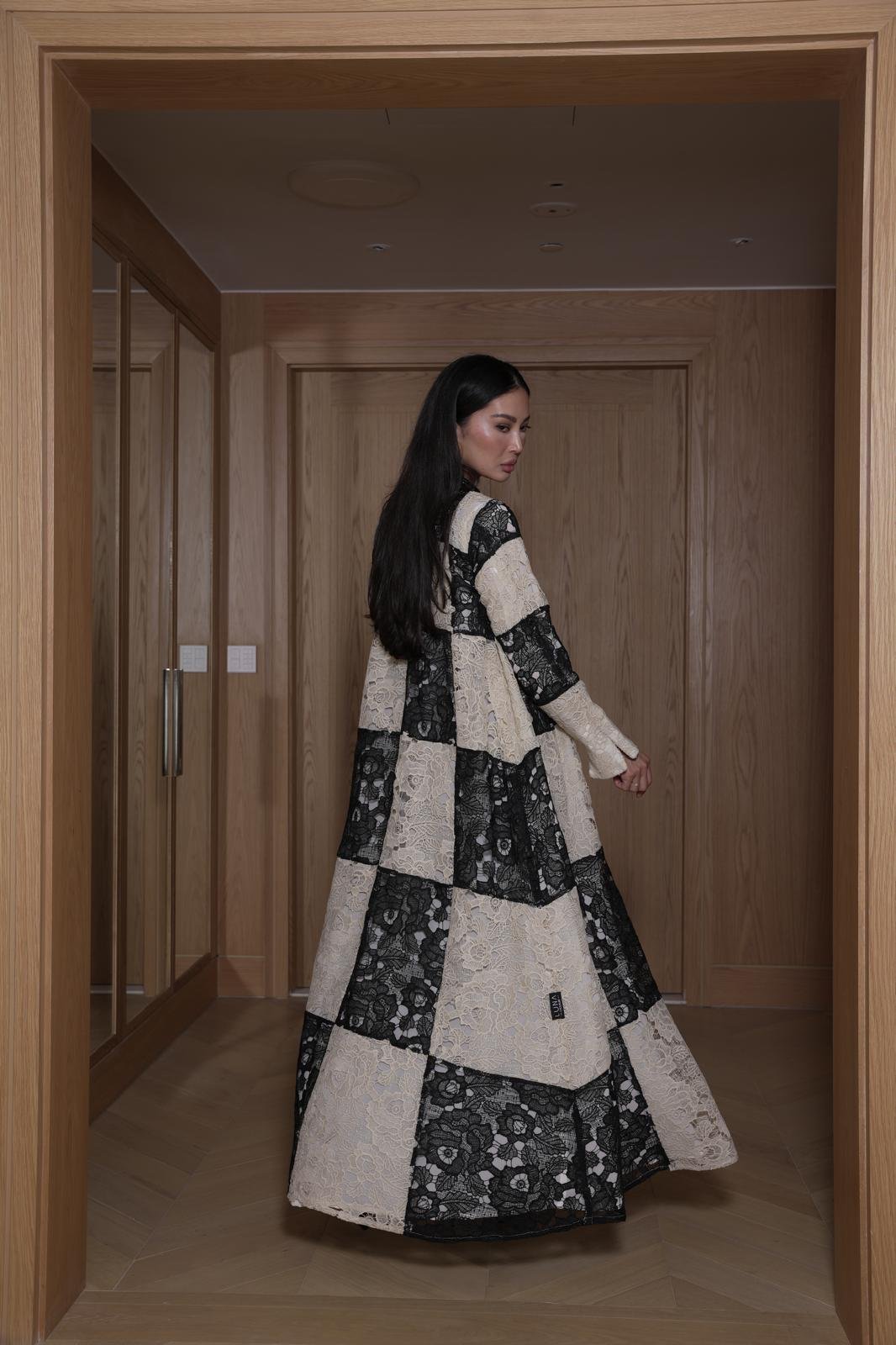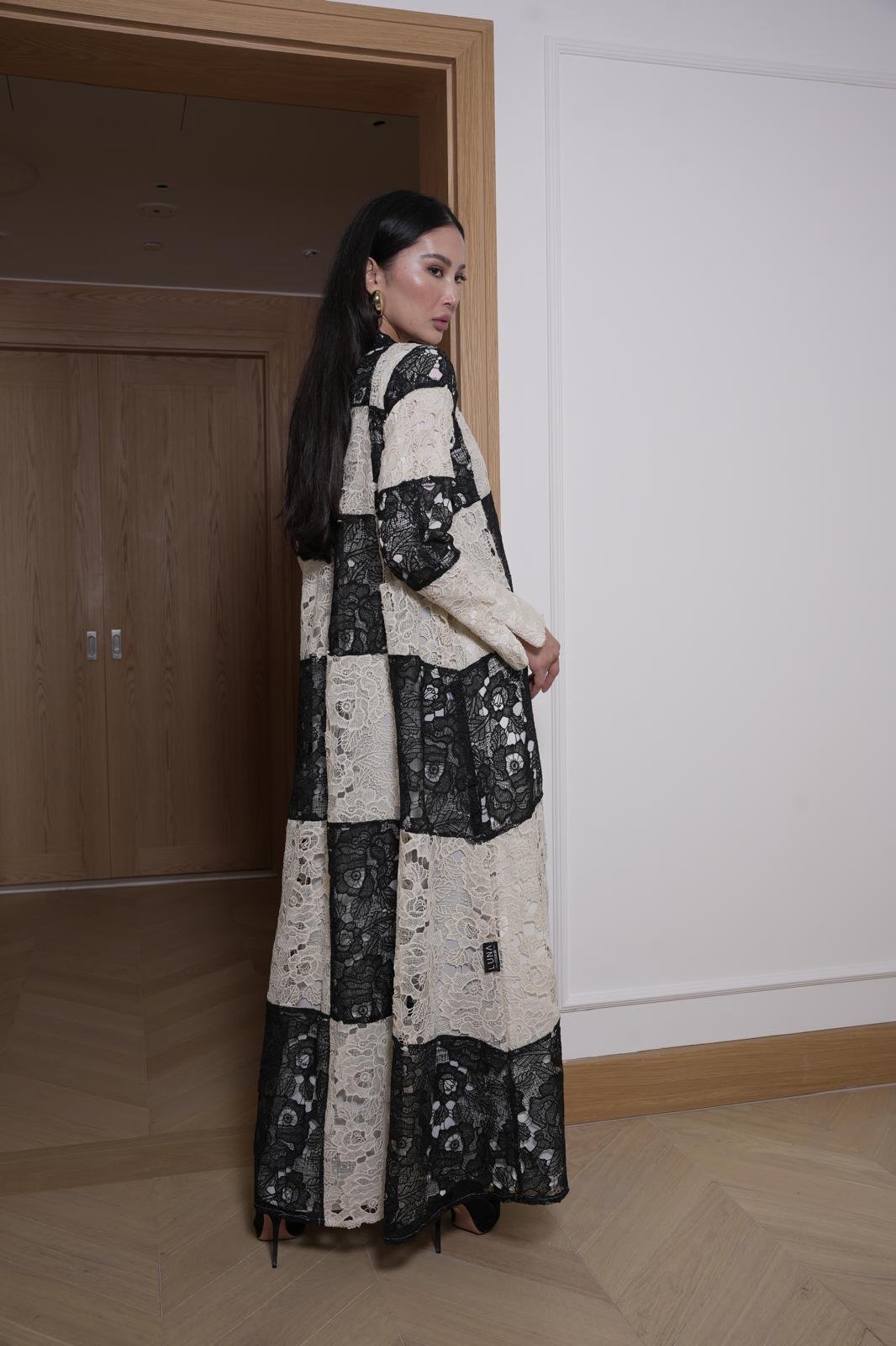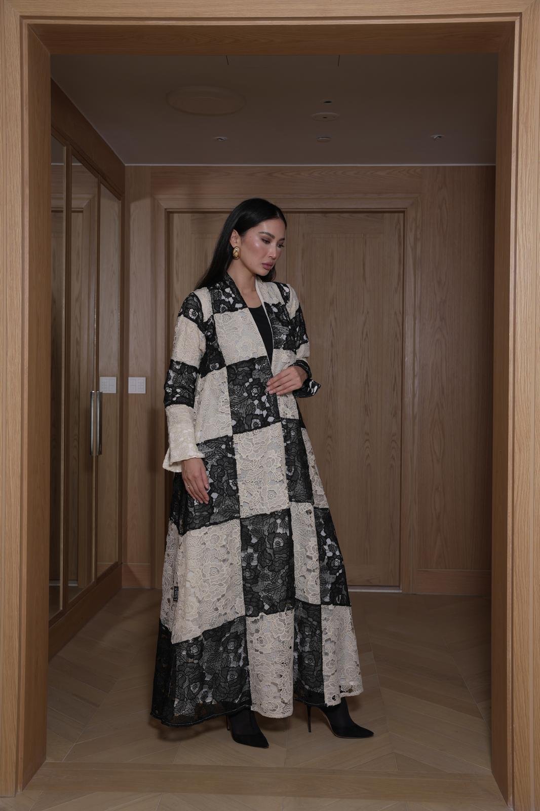 A-CUT ARCHITECTURAL ELEGANCE MEETS ARTISANAL LACE ABAYA. A BOLD, HAND-PANELED CHECKERBOARD OF INTRICATE FLORAL LACE IN CONTRASTING BEIGE AND BLACK. THIS STRUCTURED A-CUT SILHOUETTE OFFERS A MODERN,HIGH-FASHION TAKE ON CLASSIC MODESTY.