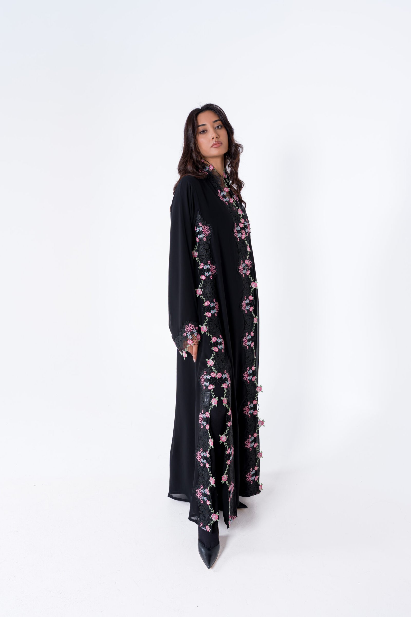 T-CUT ELEGANT CHIFFON ABAYA WITH SLITS. DETAILED BY FLORAL PINK LACE BORDERS THE FRONT OPENING, SLEEVES AND SIDES. GARDEN-INSPIRED AESTHETIC. IT’S BOTH CLASSIC AND ROMANTIC.