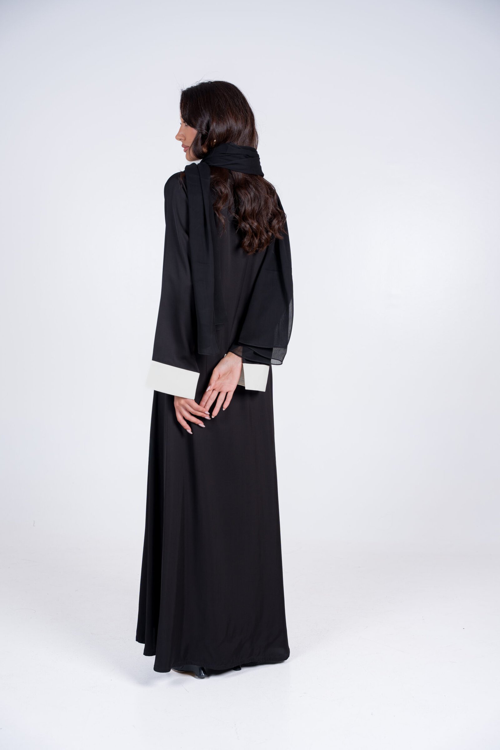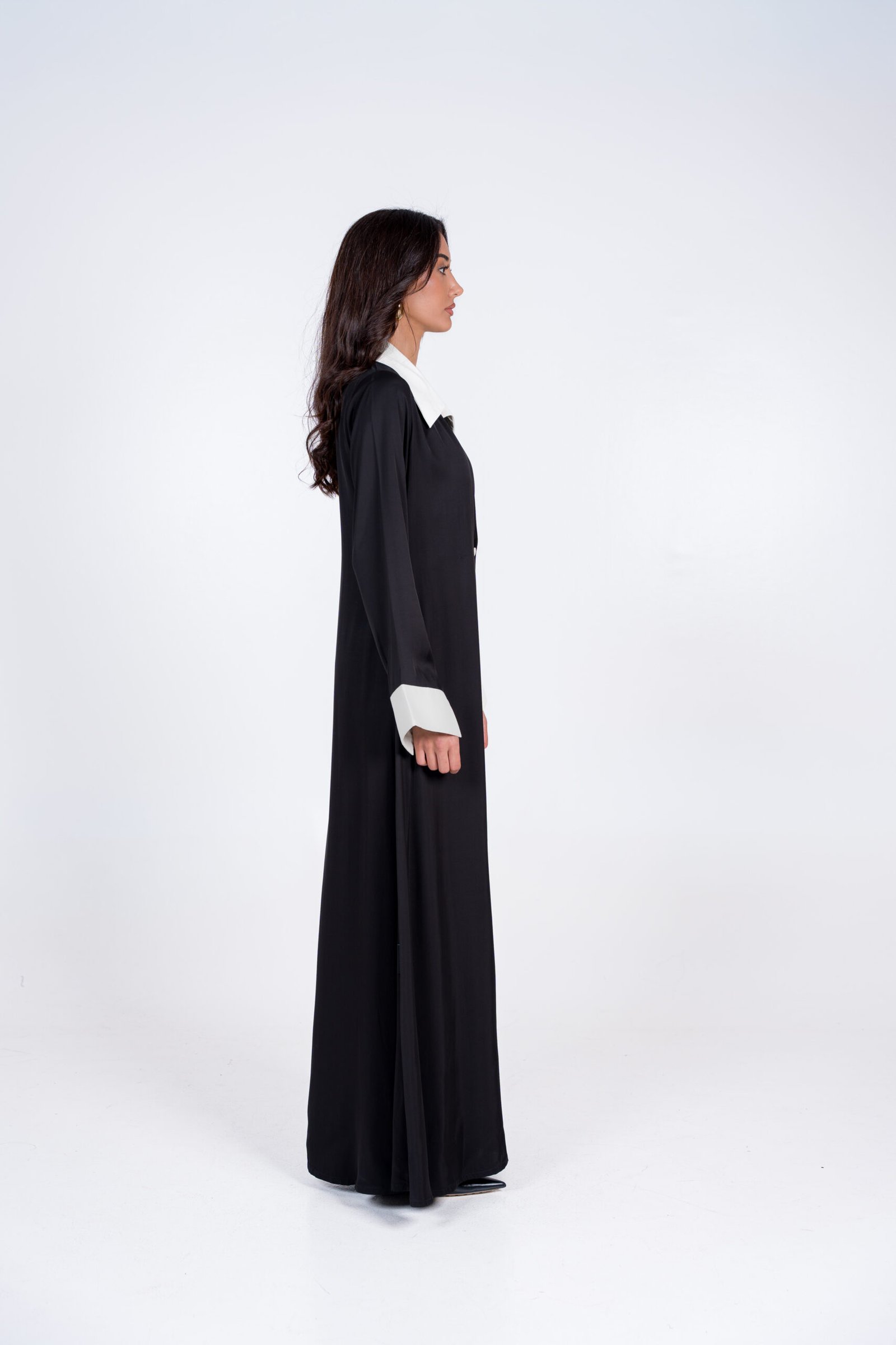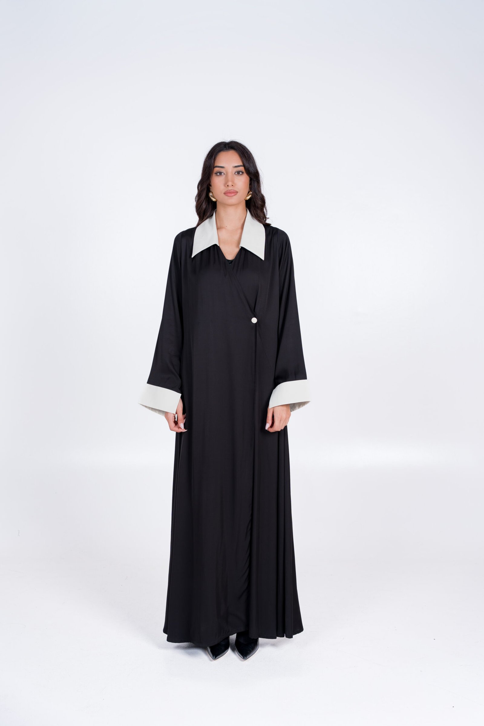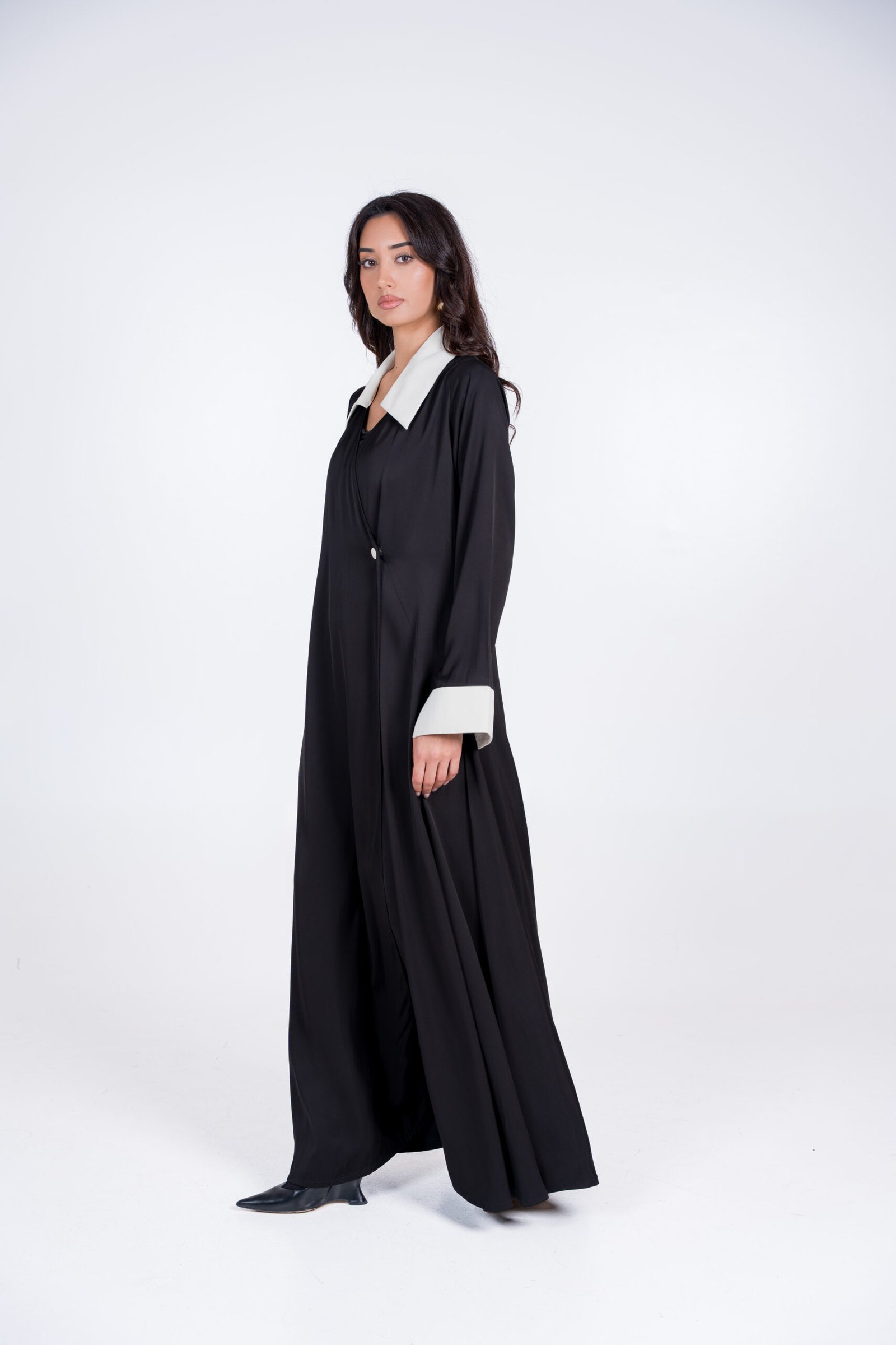 SHIRT STYLE A-CUT ROYAL CREPE ABAYA. THIS WRAP-STYLE ABAYA FEATURES A DEEP OBSIDIAN BLACK BODY WITH A CRISP IVORY-WHITE OVERSIZED COLLAR AND MATCHING FRENCH CUFFS. SECURED BY A SINGLE STATEMENT BUTTON.IT OFFERS A SHARP TRADITIONAL MODESTY WITH MODERN POWER-DRESSING.